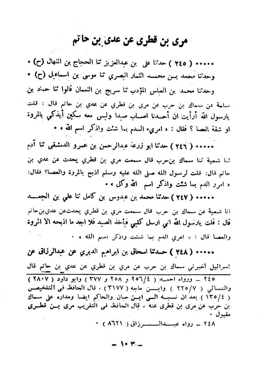 246 - حَدَّثَنَا أَبُو زُرْعَةَ عَبْدُ الرَّحْمَنِ بْنُ عَمْرٍو الدِّمَشْقِيُّ، ثَنَا آدَمُ، ثَنَا شُعْبَةُ، ثَنَا سِمَاكُ بْنُ حَرْبٍ، قَالَ: سَمِعْتُ مُرِّيَّ بْنَ قَطَرِيٍّ يُحَدِّثُ، عَنْ عَدِيِّ بْنِ حَاتِمٍ، قَالَ: قُلْتُ لِرَسُولِ اللهِ صَلَّى اللهُ عَلَيْهِ وَسَلَّمَ: أَذْبَحُ بِالْمَرْوَةِ وَالْعَصَا؟ فَقَالَ: «§أَمْرِرِ الدَّمَ بِمَا شِئْتَ وَاذْكُرِ اسْمَ اللهِ وَكُلْ»