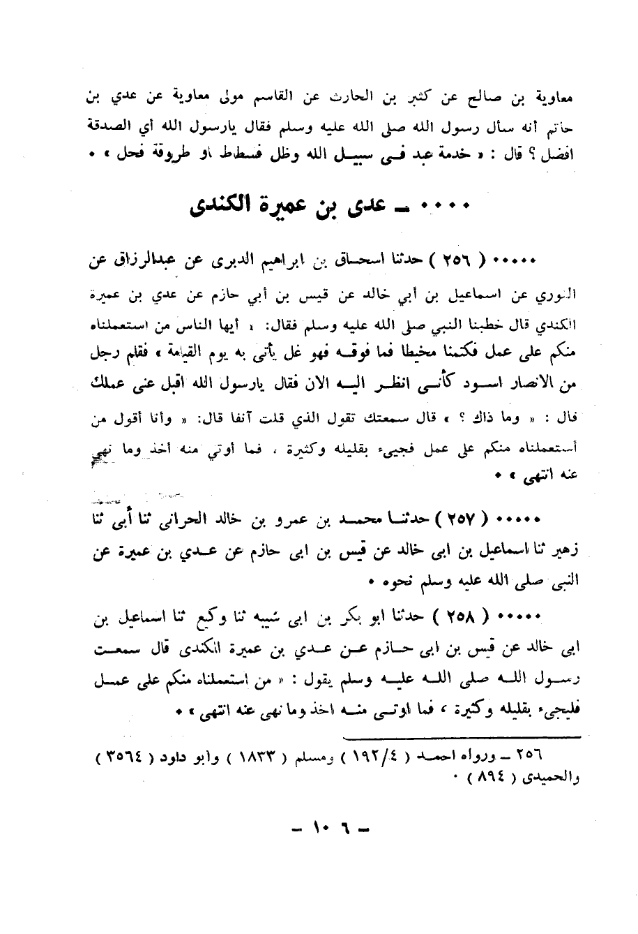 256 - حَدَّثَنَا إِسْحَاقُ بْنُ إِبْرَاهِيمَ الدَّبَرِيُّ، عَنْ عَبْدِ الرَّزَّاقِ، عَنِ الثَّوْرِيِّ، عَنْ إِسْمَاعِيلَ بْنِ أَبِي خَالِدٍ، عَنْ قَيْسِ بْنِ أَبِي حَازِمٍ، عَنْ عَدِيِّ بْنِ عُمَيْرَةَ الْكِنْدِيِّ قَالَ: خَطَبَنَا النَّبِيُّ صَلَّى اللهُ عَلَيْهِ وَسَلَّمَ فَقَالَ: «أَيُّهَا النَّاسُ، §مَنِ اسْتَعْمَلْنَاهُ مِنْكُمْ عَلَى عَمَلٍ فَكَتَمَنَا مِخْيَطًا فَمَا فَوْقَهُ فَهُوَ غُلٌّ يَأْتِي بِهِ يَوْمَ الْقِيَامَةِ» ، فَقَامَ رَجُلٌ مِنَ الْأَنْصَارِ أسْوَدُ كَأَنِّي أنْظُرُ إِلَيْهِ الْآنَ فَقَالَ: يَا رَسُولَ اللهِ، اقْبَلْ عَنِّي عَمَلَكَ قَالَ: «وَمَا ذَاك؟» قَالَ: سَمِعْتُكَ تَقُولُ الَّذِي قُلْتَ آنِفًا: قَالَ: «وَأَنَا أَقُولُ مَنِ اسْتَعْمَلْنَاهُ مِنْكُمْ عَلَى عَمَلٍ فَجِيءَ بِقَلِيلِهِ وَكَثِيرِهِ، فَمَا أُوتِيَ مِنْهُ أَخَذَ، وَمَا نُهِيَ عَنْهُ انْتَهَى»