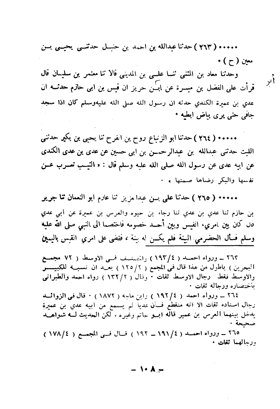 263 - حَدَّثَنَا عَبْدُ اللهِ بْنُ أَحْمَدَ بْنِ حَنْبَلٍ، حَدَّثَنِي يَحْيَى بْنُ مَعِينٍ، ح وَحَدَّثَنَا مُعَاذُ بْنُ الْمُثَنَّى، ثَنَا عَلِيُّ بْنُ الْمَدِينِيِّ قَالَا: ثَنَا مُعْتَمِرُ بْنُ سُلَيْمَانَ، قَالَ: قَرَأْتُ عَلَى الْفَضْلِ بْنِ مَيْسَرَةَ، عَنْ ابْنِ حَرِيزٍ، أَنَّ قَيْسَ بْنَ أَبِي حَازِمٍ، حَدَّثَهُ أَنَّ عَدِيَّ بْنَ عُمَيْرَةَ الْكِنْدِيَّ حَدَّثَهُ أَنَّ رَسُولَ اللهِ صَلَّى اللهُ عَلَيْهِ وَسَلَّمَ كَانَ §إِذَا سَجَدَ جَافَى حَتَّى يُرَى بَيَاضُ إِبْطَيْهِ