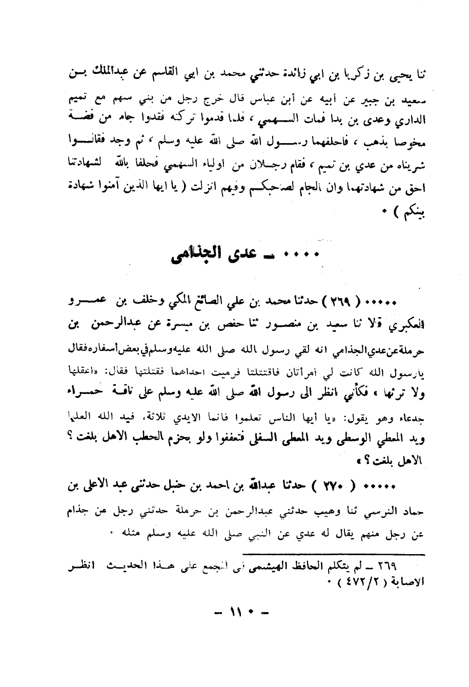 270 - حَدَّثَنَا عَبْدُ اللهِ بْنُ أَحْمَدَ بْنِ حَنْبَلٍ، حَدَّثَنِي عَبْدُ الْأَعْلَى بْنُ حَمَّادٍ النَّرْسِيُّ، ثَنَا وُهَيْبٌ، حَدَّثَنِي عَبْدُ الرَّحْمَنِ بْنُ حَرْمَلَةَ، حَدَّثَنِي رَجُلٌ، مِنْ جُذَامٍ، عَنْ رَجُلٍ مِنْهُمْ يُقَالُ لَهُ عَدِيٌّ، عَنِ النَّبِيِّ صَلَّى اللهُ عَلَيْهِ وَسَلَّمَ مِثْلَهُ