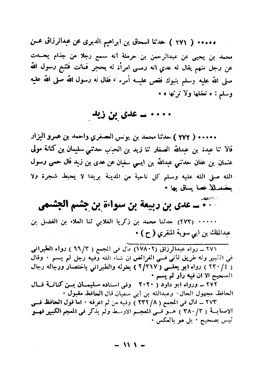 272 - حَدَّثَنَا مُحَمَّدُ بْنُ يُونُسَ الْعُصْفُرِيُّ، وَأَحْمَدُ بْنُ عَمْرٍو الْبَزَّارُ قَالَا: ثَنَا عَبْدَةُ بْنُ عَبْدِ اللهِ الصَّفَّارُ، ثَنَا زَيْدُ بْنُ الْحُبَابِ، حَدَّثَنِي سُلَيْمَانُ بْنُ كِنَانَةَ، مَوْلَى عُثْمَانَ بْنِ عَفَّانَ، حَدَّثَنِي عَبْدُ اللهِ بْنُ أَبِي سُفْيَانَ، عَنْ عَدِيِّ بْنِ زَيْدٍ قَالَ: «§حَمَى رَسُولُ اللهِ صَلَّى اللهُ عَلَيْهِ وَسَلَّمَ كُلَّ نَاحِيَةٍ مِنَ الْمَدِينَةِ بَرِيدًا لَا يُخْبَطُ شَجَرُهُ، وَلَا يُعْضَدُ إلَّا عَصًا يُسَاقُ بِهَا»