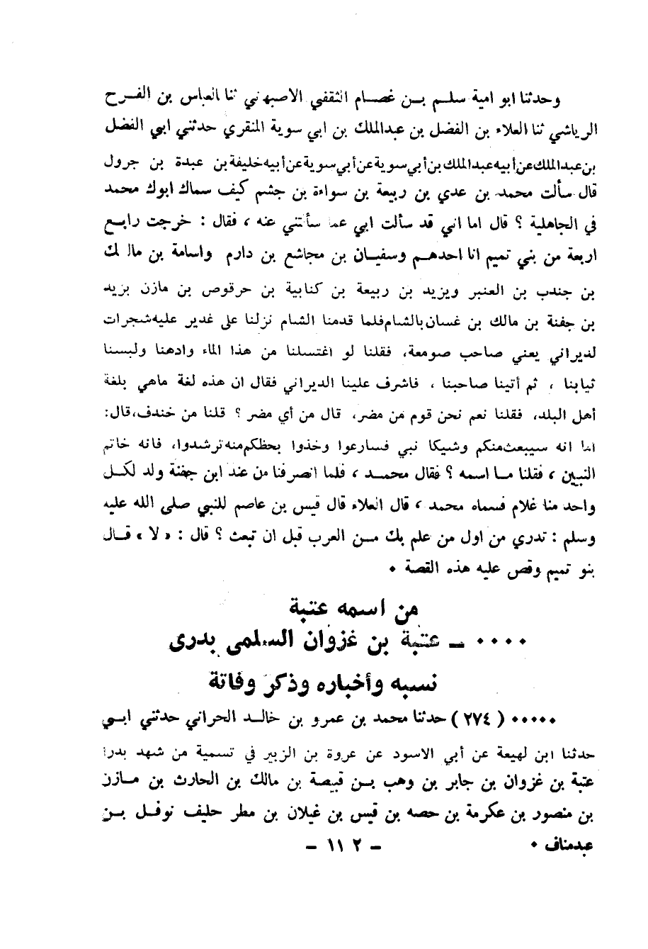 274 - حَدَّثَنَا مُحَمَّدُ بْنُ عَمْرِو بْنِ خَالِدٍ الْحَرَّانِيُّ، حَدَّثَنِي أَبِي، حَدَّثَنَا ابْنُ لَهِيعَةَ، عَنْ أَبِي الْأَسْوَدِ، عَنْ عُرْوَةَ بْنِ الزُّبَيْرِ، فِي §تَسْمِيَةِ مَنْ شَهِدَ بَدْرًا عُتْبَةُ بْنُ غَزْوَانَ بْنِ جَابِرِ بْنِ وَهْبِ بْنِ قَبِيصَةَ بْنِ مَالِكِ بْنِ الْحَارِثِ بْنِ مَازِنِ بْنِ مَنْصُورِ بْنِ عِكْرِمَةَ بْنِ حِصَّةَ بْنِ قَيْسِ بْنِ غَيْلَانَ بْنِ مَطَرٍ حَلِيفُ نَوْفَلِ بْنِ عَبْدِ مَنَافٍ