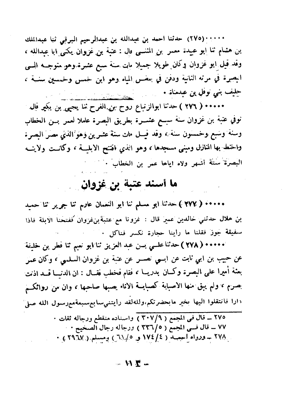 275 - حَدَّثَنَا أَحْمَدُ بْنُ عَبْدِ اللهِ بْنِ عَبْدِ الرَّحِيمِ الْبَرْقِيُّ، ثَنَا عَبْدُ الْمَلِكِ بْنِ هِشَامٍ، ثَنَا أَبُو عُبَيْدَةَ مَعْمَرُ بْنُ الْمُثَنَّى قَالَ: " §عُتْبَةُ بْنُ غَزْوَانَ يُكْنَى أَبَا عَبْدِ اللهِ وَقَدْ قِيلَ: أَبُو غَزْوَانَ وَكَانَ طَوِيلًا جَمِيلًا مَاتَ سَنَةَ سَبْعَ عَشْرَةَ وَهُوَ مُتَوَجِّهٌ إِلَى الْبَصْرَةِ فِي مَرَّتِهِ الثَّانِيَةِ وَدُفِنَ فِي بَعْضِ الْمِيَاهِ وَهُوَ ابْنُ خَمْسٍ وَخَمْسِينَ سَنَةً حَلِيفُ بَنِي نَوْفَلِ بْنِ عَبْدِ مَنَاةَ "