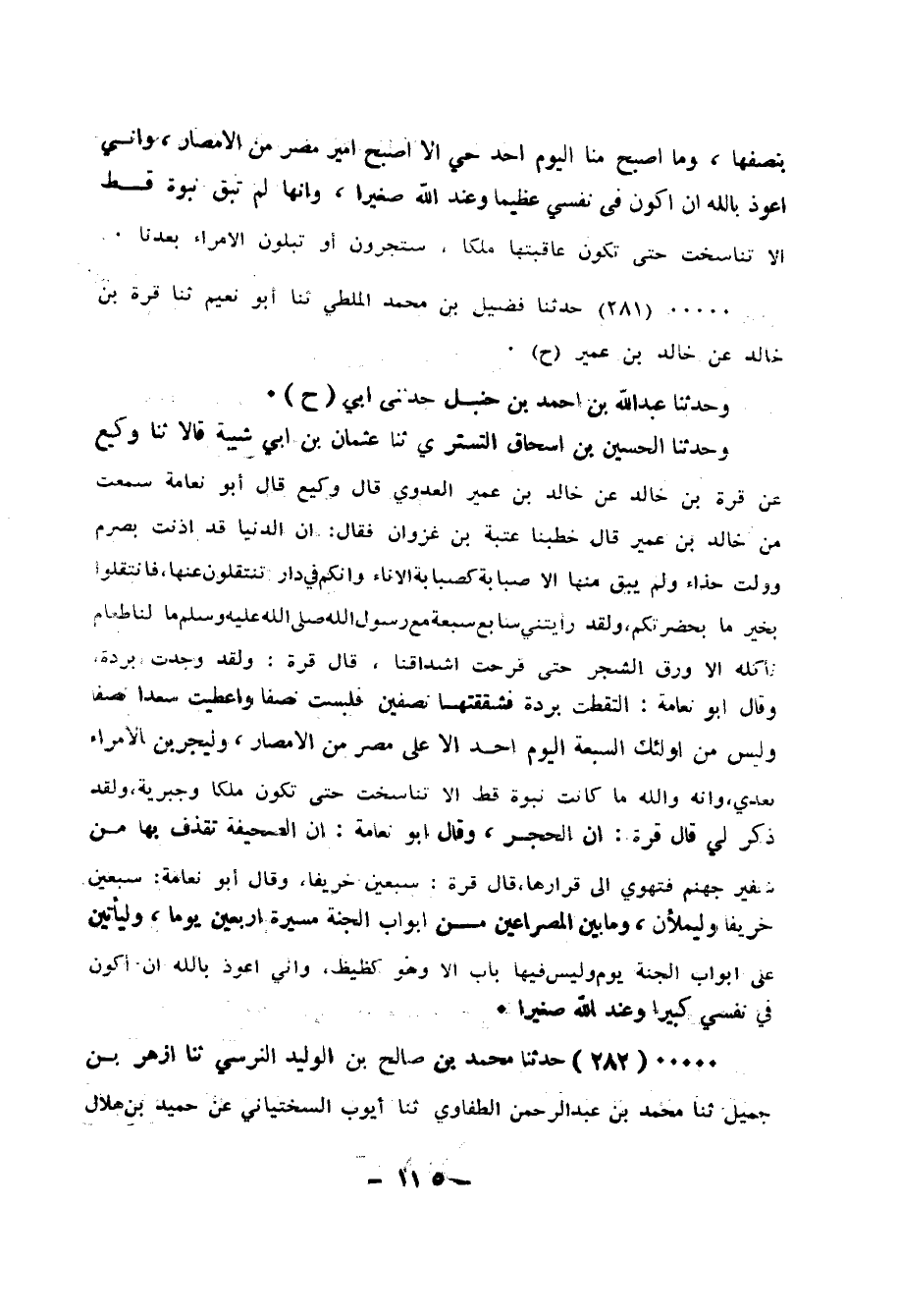 282 - حَدَّثَنَا مُحَمَّدُ بْنُ صَالِحِ بْنِ الْوَلِيدِ النَّرْسِيُّ، ثَنَا أَزْهَرُ بْنُ جَمِيلٍ، ثَنَا مُحَمَّدُ بْنُ عَبْدِ الرَّحْمَنِ الطُّفَاوِيُّ، ثَنَا أَيُّوبُ السَّخْتِيَانِيُّ، عَنْ حُمَيْدِ بْنِ هِلَالٍ، عَنْ خَالِدِ بْنِ عُمَيْرٍ، عَنْ عُتْبَةَ بْنِ غَزْوَانَ فَذَكَرَ الْحَدِيثَ -[116]-.