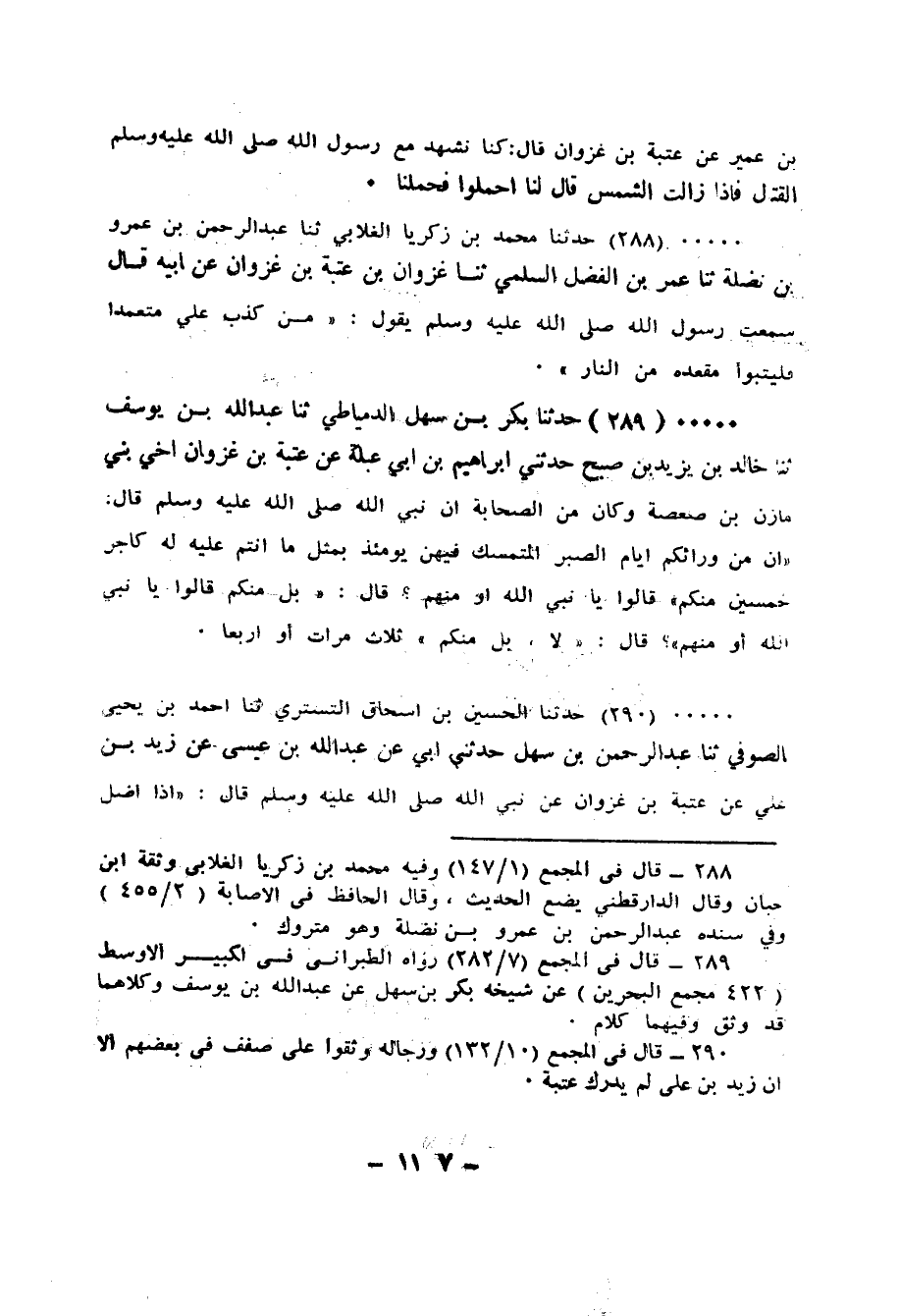 288 - حَدَّثَنَا مُحَمَّدُ بْنُ زَكَرِيَّا الْغَلَابِيُّ، ثَنَا عَبْدُ الرَّحْمَنِ بْنُ عَمْرِو بْنِ نَضْلَةَ، ثَنَا عُمَرُ بْنُ الْفَضْلِ السُّلَمِيُّ، ثَنَا غَزْوَانُ بْنُ عُتْبَةَ بْنِ غَزْوَانَ، عَنْ أَبِيهِ، قَالَ: سَمِعْتُ رَسُولَ اللهِ صَلَّى اللهُ عَلَيْهِ وَسَلَّمَ يَقُولُ: «§مَنْ كَذَبَ عَلَيَّ مُتَعَمِّدًا، فَلْيَتَبَوَّأْ مَقْعَدَهُ مِنَ النَّارِ»