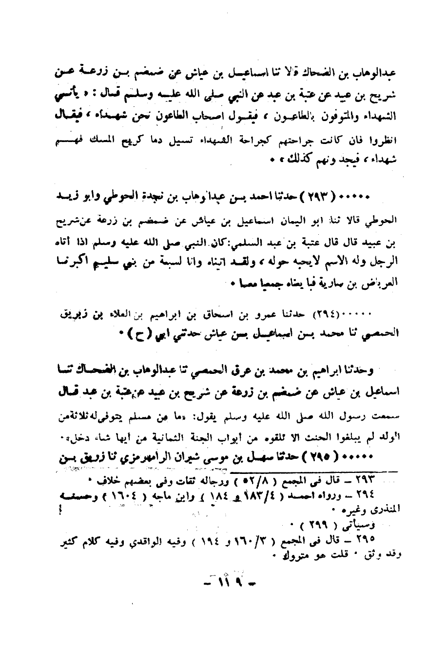 294 - حَدَّثَنَا عَمْرُو بْنُ إِسْحَاقَ بْنِ إِبْرَاهِيمَ بْنِ الْعَلَاءِ بْنِ زبريق الْحِمْصِيُّ، ثَنَا مُحَمَّدُ بْنُ إِسْمَاعِيلَ بْنِ عَيَّاشٍ، حَدَّثَنِي أَبِي ح، وَحَدَّثَنَا إِبْرَاهِيمُ بْنُ مُحَمَّدِ بْنِ عِرْقٍ الْحِمْصِيُّ، ثَنَا عَبْدُ الْوَهَّابِ بْنُ الضَّحَّاكِ، ثَنَا إِسْمَاعِيلُ بْنُ عَيَّاشٍ، عَنْ ضَمْضَمِ بْنِ زُرْعَةَ، عَنْ شُرَيْحِ بْنِ عُبَيْدٍ، عَنْ عُتْبَةَ بْنِ عَبْدٍ قَالَ: سَمِعْتُ رَسُولَ اللهِ صَلَّى اللهُ عَلَيْهِ وَسَلَّمَ يَقُولُ: «§مَا مِنْ مُسْلِمٍ يُتَوَفَّى لَهُ ثَلَاثَةٌ مِنَ الْوَلَدِ لَمْ يَبْلُغُوا الْحِنْثَ إِلَّا تَلَقَّوْهُ مِنْ أَبْوَابِ الْجَنَّةِ الثَّمَانِيَةِ مِنْ أَيِّهَا شَاءَ دَخَلَ»