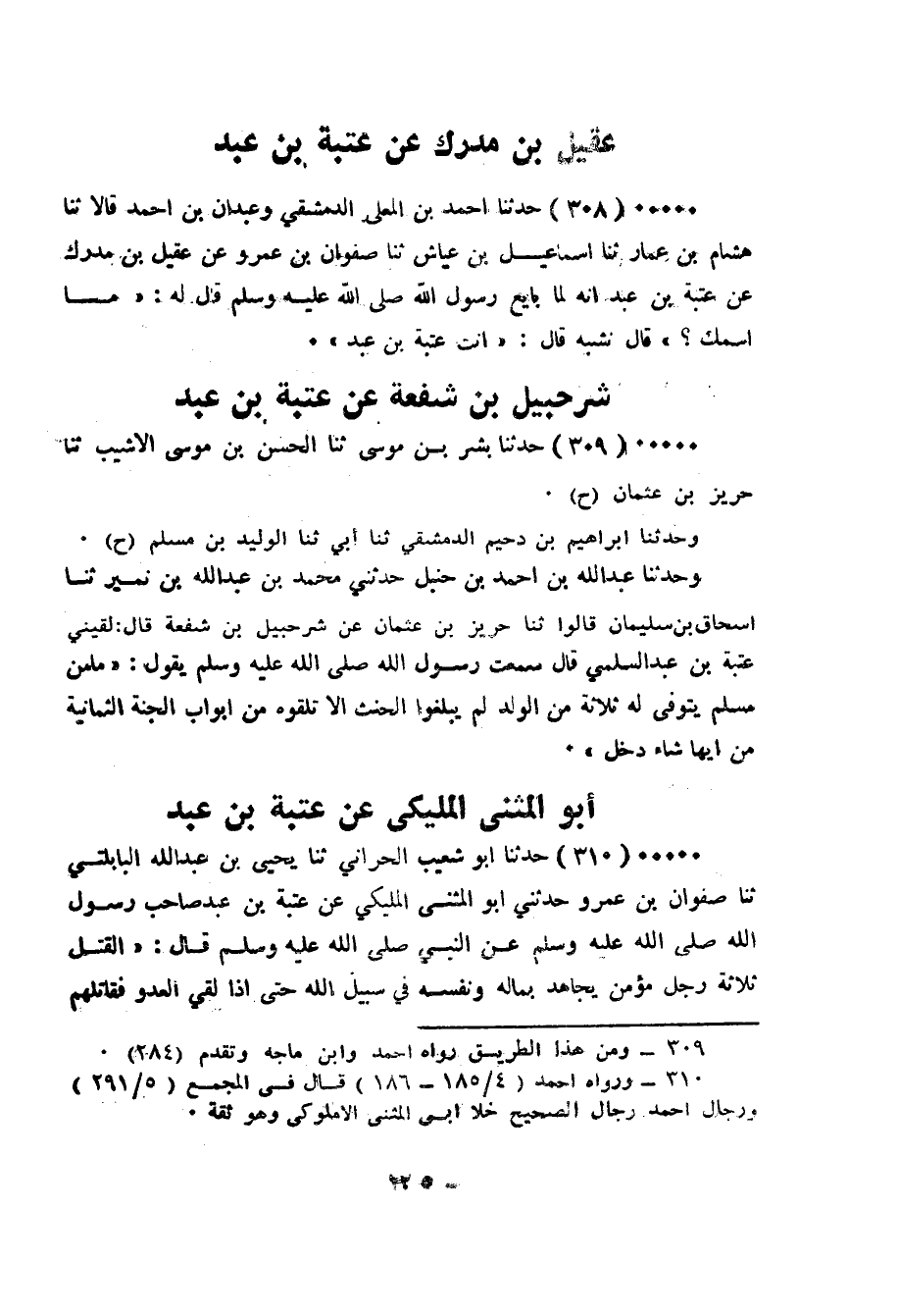 309 - حَدَّثَنَا بِشْرُ بْنُ مُوسَى، ثَنَا الْحَسَنُ بْنُ مُوسَى الْأَشْيَبُ، ثَنَا حَرِيزُ بْنُ عُثْمَانَ، ح وَحَدَّثَنَا إِبْرَاهِيمُ بْنُ دُحَيْمٍ الدِّمَشْقِيُّ، ثَنَا أَبِي، ثَنَا الْوَلِيدُ بْنُ مُسْلِمٍ، ح وَحَدَّثَنَا عَبْدُ اللهِ بْنُ أَحْمَدَ بْنِ حَنْبَلٍ، حَدَّثَنِي مُحَمَّدُ بْنُ عَبْدِ اللهِ بْنِ نُمَيْرٍ، ثَنَا إِسْحَاقُ بْنُ سُلَيْمَانَ، قَالُوا: ثَنَا حَرِيزُ بْنُ عُثْمَانَ، عَنْ شُرَحْبِيلَ بْنِ شُفْعَةَ قَالَ: لَقِيَنِي عُتْبَةُ بْنُ عَبْدٍ السُّلَمِيُّ قَالَ: سَمِعْتُ رَسُولَ اللهِ صَلَّى اللهُ عَلَيْهِ وَسَلَّمَ يَقُولُ: «§مَا مِنْ مُسْلِمٍ يُتَوَفَّى لَهُ ثَلَاثَةٌ مِنَ الْوَلَدِ لَمْ يَبْلُغُوا الْحِنْثَ، إِلَّا تَلَقَّوْهُ مِنْ أَبْوَابِ الْجَنَّةِ الثَّمَانِيَةِ مِنْ أَيِّهَا شَاءَ دَخَلَ»