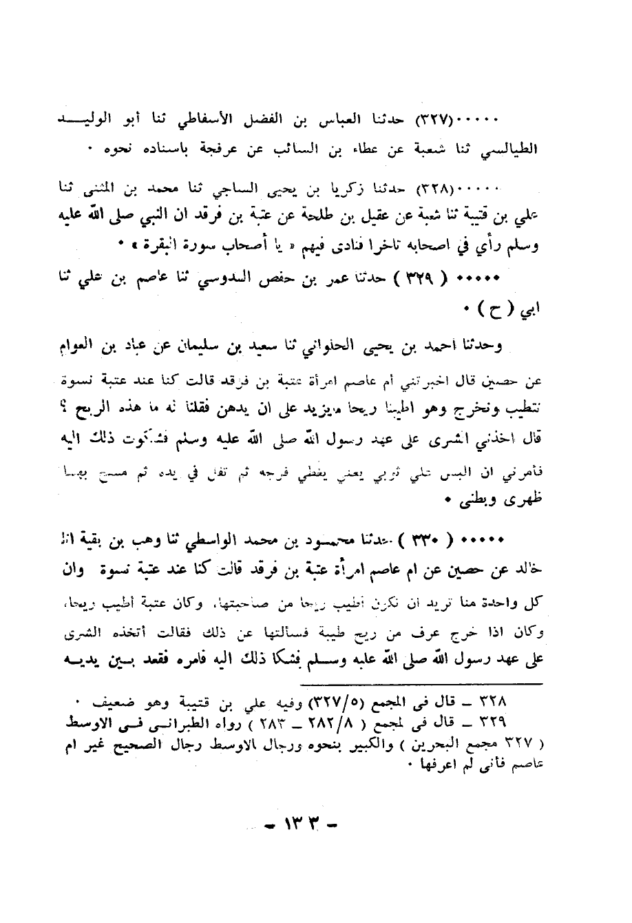 330 - حَدَّثَنَا مَحْمُودُ بْنُ مُحَمَّدٍ الْوَاسِطِيُّ، ثَنَا وَهْبُ بْنُ بَقِيَّةَ، أَنَا خَالِدٌ، عَنْ حُصَيْنٍ، عَنْ أُمِّ عَاصِمٍ، امْرَأَةِ عُتْبَةَ بْنِ فَرْقَدٍ قَالَتْ: كُنَّا عِنْدَ عُتْبَةَ نِسْوَةً، وَإنَّ كُلَّ وَاحِدَةٍ مِنَّا تُرِيدُ أَنْ تَكُونَ أَطْيَبَ رِيحًا مِن صَاحِبَتِهَا، وَكَانَ عُتْبَةُ أَطْيَبَ رِيحًا، وَكَان إِذَا خَرَجَ عُرِفَ مِن رِيحٍ طَيِّبََةٍ فَسَأَلْتُهَا عَنْ ذَلِك فَقَالَتْ: §اتَّخَذَهُ الشَّرَى عَلَى عَهْدِ رَسُولِ اللهِ صَلَّى الله عَلَيْه وَسَلَّمَ فَشَكَا ذَلِك إِلَيْه «فَأَمَرَهُ فَقَعَدَ بَيْنَ يَدَيْهِ وَجَعَلَ يَدَهُ عَلَى فَرْجِهِ، ثُمّ تَفَلَ النَّبِيُّ صَلَّى الله عَلَيْه وَسَلَّمَ فِي يَدِهِ فَمَسَحَ ظَهْرَهُ وَبَطْنَهُ»