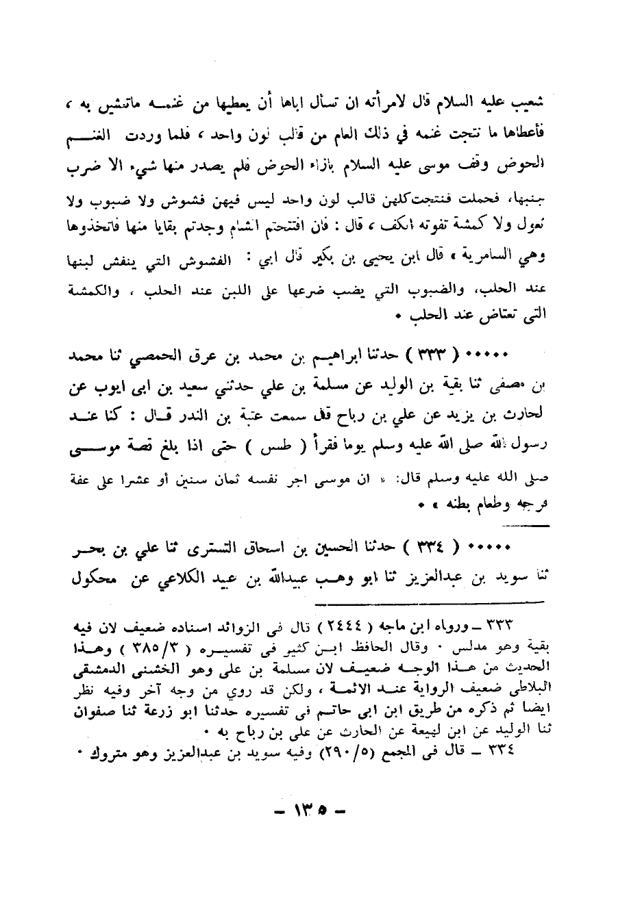 333 - حَدَّثَنَا إِبْرَاهِيمُ بْنُ مُحَمَّدِ بْنِ عِرْقٍ الْحِمْصِيُّ، ثَنَا مُحَمَّدُ بْنُ مُصَفَّى، ثَنَا بَقِيَّةُ بْنُ الْوَلِيدِ، عَنْ مَسْلَمَةَ بْنِ عَلِيٍّ، حَدَّثَنِي سَعِيدُ بْنُ أَبِي أَيُّوبَ، عَنِ الْحَارِثِ بْنِ يَزِيدَ، عَنْ عَلِيِّ بْنِ رَبَاحٍ، قَالَ: سَمِعْتُ عُتْبَةَ بْنَ النُّدَّرِ، قَالَ: كُنَّا عِنْدَ رَسُولِ اللهِ صَلَّى الله عَلَيْه وَسَلَّمَ يَوْمًا، " §فَقَرَأَ طس حَتَّى إِذَا بَلَغ قِصَّةَ مُوسَى صَلَّى الله عَلَيْه وَسَلَّمَ قَالَ: إنَّ مُوسَى أَجَّرَ نَفْسَهُ ثَمَانِ سِنِينَ أَو عَشْرًا عَلَى عِفَّةِ فَرْجِهِ وَطَعَامِ بَطْنِهِ "