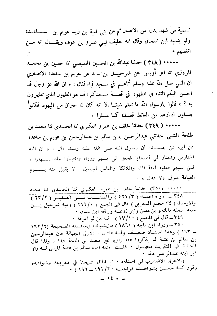 348 - حَدَّثَنَا عَبْدُ اللهِ بْنُ الْحُسَيْنِ الْمِصِّيصِيُّ، ثَنَا حُسَيْنُ بْنُ مُحَمَّدٍ الْمَرْوَزِيُّ، ثَنَا أَبُو أُوَيْسٍ، عَنْ شُرَحْبِيلَ بْنِ سَعْدٍ، عَنْ عُوَيْمِ بْنِ سَاعِدَةَ الْأَنْصَارِيِّ، أَنَّ النَّبِيَّ صَلَّى الله عَلَيْه وَسَلَّمَ أَتَاهُمْ فِي مَسْجِدِ قُبَاءَ فَقَالَ: «§إنَّ اللهَ عَزَّ وَجَلَّ قَدْ أَحْسَنَ إِلَيْكُم الثَّنَاءَ فِي الطُّهُورِ فِي قِصَّةِ مَسْجِدِكُمْ فَمَا هُو الطُّهُورُ الَّذِي تَطَّهَّرُونَ بِهِ؟» قَالُوا: يَا رَسُولَ اللهِ مَا نَعْلَمُ شَيْئًا إِلَّا أَنَّه كَان لَنَا جِيرَانٌ مِن الْيَهُودِ، فَكَانُوا يَغْسِلُونَ أَدْبَارَهُمْ مِنَ الْغَائِطِ فَغَسَلْنَا كَمَا غَسَلُوا