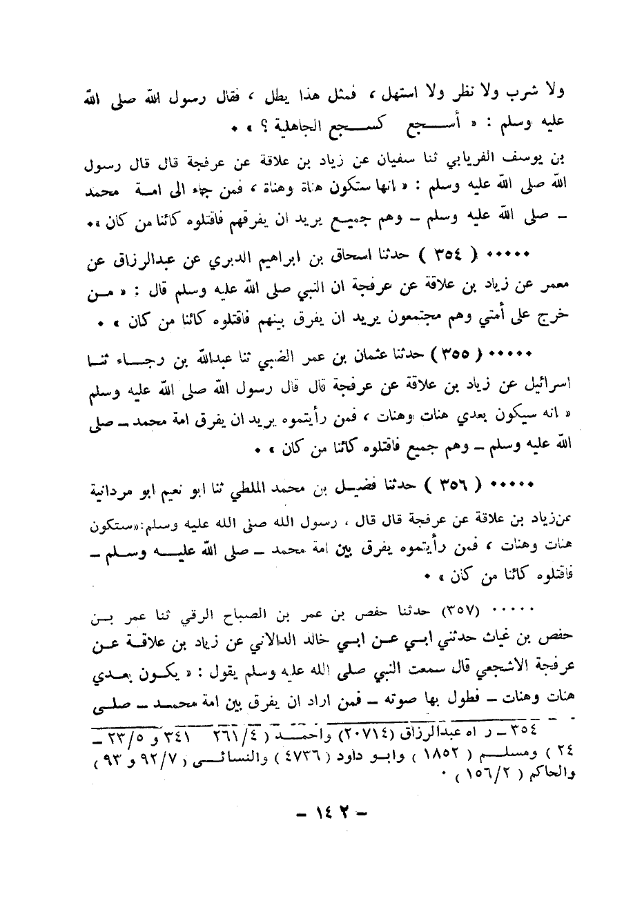 355 - حَدَّثَنَا عُثْمَانُ بْنُ عُمَرَ الضَّبِّيُّ، ثَنَا عَبْدُ اللهِ بْنُ رَجَاءٍ، ثَنَا إِسْرَائِيلُ، عَنْ زِيَادِ بْنِ عِلَاقَةَ، عَنْ عَرْفَجَةَ قَالَ: قَالَ رَسُولُ اللهِ صَلَّى الله عَلَيْه وَسَلَّمَ: «§إنَّهُ سَيَكُونُ بَعْدِي هَنَاتٌ، وَهَنَاتٌ، فَمَنْ رَأَيْتُمُوهُ يُرِيدُ أَنْ يُفَرِّقَ أُمَّةِ مُحَمَّدٍ صَلَّى الله عَلَيْه وَسَلَّمَ وَهُمْ جَمِيعٌ فَاقْتُلُوه كَائِنًا مَنْ كَانَ»