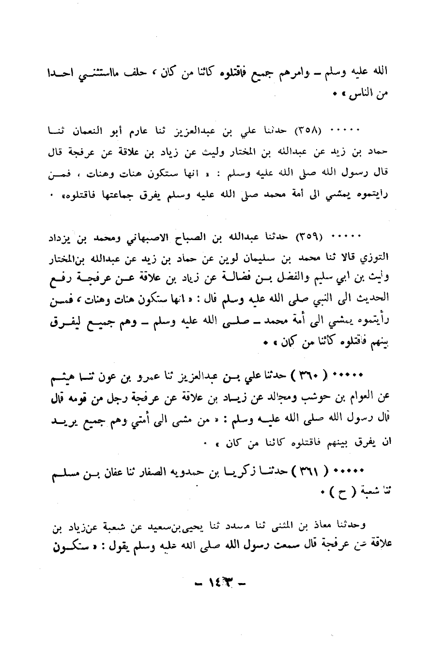 359 - حَدَّثَنَا عَبْدُ اللهِ بْنُ الصَّبَّاحِ الْأَصْبَهَانِيُّ، وَمُحَمَّدُ بْنُ يَزْدَادَ التَّوَّزِيُّ قَالَا: ثَنَا مُحَمَّدُ بْنُ سُلَيْمَانَ لُوَيْنٌ، عَنْ حَمَّادِ بْنِ زَيْدٍ، عَنْ عَبْدِ اللهِ بْنِ الْمُخْتَارِ، وَلَيْثِ بْنِ أَبِي سُلَيْمٍ، وَالْفَضْلِ بْنِ فَضَالَةَ، عَنْ زِيَادِ بْنِ عِلَاقَةَ، عَنْ عَرْفَجَةَ، رَفَعَ الْحَدِيثَ إِلَى النَّبِيِّ صَلَّى الله عَلَيْه وَسَلَّمَ قَالَ: «§إنَّهَا سَتَكُونُ هَنَاتٌ، وَهَنَاتٌ، فَمَنْ رَأَيْتُمُوهُ يَمْشِي إِلَى أُمَّةِ مُحَمَّدٍ صَلَّى الله عَلَيْه وَسَلَّمَ وَهُمْ جَمِيعٌ لَيُفَرِّقَ بَيْنَهُمْ فَاقْتُلُوهُ كَائِنًا مَنْ كَانَ»