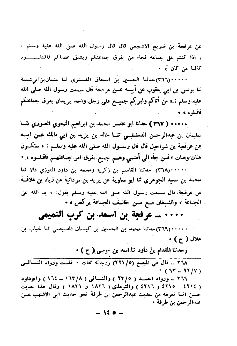 367 - حَدَّثَنَا أَبُو عَامِرٍ مُحَمَّدُ بْنُ إِبْرَاهِيمَ النَّحْوِيُّ الصُّورِيُّ، ثَنَا سُلَيْمَانُ بْنُ عَبْدِ الرَّحْمَنِ الدِّمَشْقِيُّ، ثَنَا خَالِدُ بْنُ يَزِيدَ بْنِ أَبِي مَالِكٍ، عَنْ أَبِيهِ، عَنْ عَرْفَجَةَ بْنِ شَرَاحِيلَ قَالَ: قَالَ رَسُولُ اللهِ صَلَّى الله عَلَيْه وَسَلَّمَ: «§سَتَكُونُ هَنَاتٌ، وَهَنَاتٌ، فَمَنْ جَاءَ إِلَى أُمَّتِي وَهُم جَمِيعٌ يُفَرِّقُ أَمْرَ جَمَاعَتِهِمْ فَاقْتُلُوهُ»