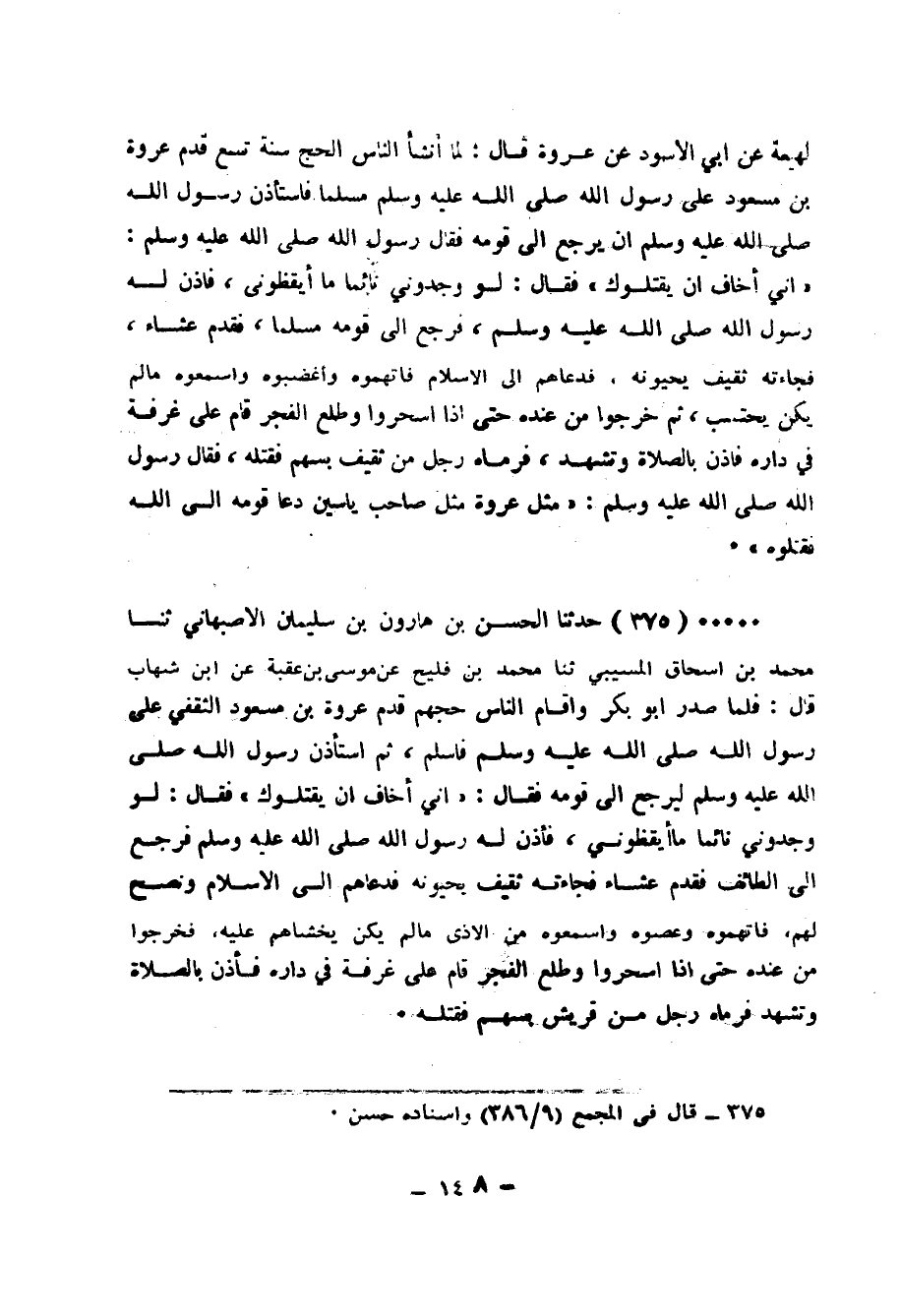 375 - حَدَّثَنَا الْحَسَنُ بْنُ هَارُونَ بْنِ سُلَيْمَانَ الْأَصْبَهَانِيُّ، ثَنَا مُحَمَّدُ بْنُ إِسْحَاقَ الْمُسَيَّبِيُّ، ثَنَا مُحَمَّدُ بْنُ فُلَيْحٍ، عَنْ مُوسَى بْنُ عُقْبَةَ، عَنِ ابْنِ شِهَابٍ قَالَ: فَلَمَّا صَدَرَ أَبُو بَكْرٍ وأَقَامَ النَّاسُ حَجَّهُمْ قَدِمَ عُرْوَةُ بْنُ مَسْعُودٍ الثَّقَفِيُّ عَلَى رَسُولِ اللهِ صَلَّى الله عَلَيْه وَسَلَّمَ فَأَسْلَمَ، ثُمَّ اسْتَأْذَنَ رَسُولَ اللهِ صَلَّى الله عَلَيْه وَسَلَّمَ لِيَرْجِعَ إِلَى قَوْمِهِ فَقَالَ: «§إنِّي أَخَافُ أَن يَقْتُلوكَ» فَقَالَ: لَو وَجَدُوني نَائِمًا مَا أَيْقَظُونِي، فَأَذِنَ لَه رَسُولُ اللهِ صَلَّى الله عَلَيْه وَسَلَّمَ فَرَجَعَ إِلَى الطَّائِفِ فَقَدَّمَ عَشَاءً فَجَاءَتْهُ ثَقِيفٌ يُحَيِّونَهُ فَدَعَاهُم إِلَى الْإِسْلَامِ وَنَصَحَ لَهُم فاتَّهَمُوهُ وعَصَوْهُ وأَسْمَعُوهُ مِن الْأَذَى مَا لَم يَكُنْ يخشاهُمْ عَلَيْه فَخَرَجُوا مِن عِنْدِهِ حَتَّى إِذَا اسَّحَّرُوا وَطَلَعَ الْفَجْرُ قَامَ عَلَى غُرْفَةٍ فِي دَارِهِ فَأَذَّنَ بِالصَّلَاةِ وَتَشَهَّدَ، فَرَمَاهُ رَجُلٌ مِن قُرَيْشٍ بِسَهْمٍ فَقَتَلَهُ "