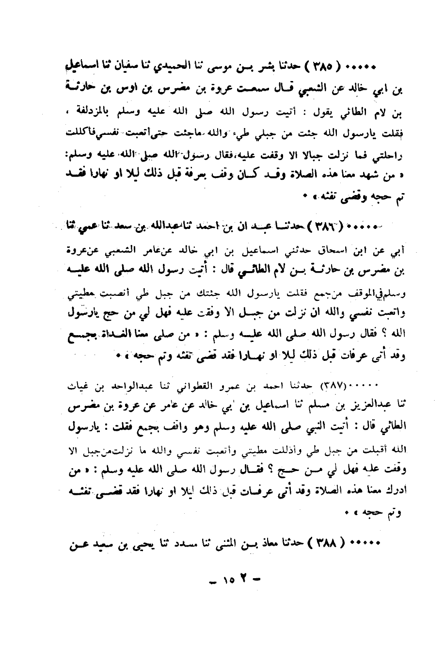 385 - حَدَّثَنَا بِشْرُ بْنُ مُوسَى، ثَنَا الْحُمَيْدِيُّ، ثَنَا سُفْيَانُ، ثَنَا إِسْمَاعِيلُ بْنُ أَبِي خَالِدٍ، عَنِ الشَّعْبِيِّ قَالَ: سَمِعْتُ عُرْوَةَ بْنَ مُضَرِّسِ بْنِ أَوْسِ بْنِ حَارِثَةَ بْنِ لَامَ الطَّائِيَّ، يَقُولُ " أَتَيْتُ رَسُولَ اللهِ صَلَّى الله عَلَيْه وَسَلَّمَ بِالْمُزْدَلِفَةِ فَقُلْتُ: يَا رَسُولَ اللهِ، جِئْتُ مِن جَبَلَيْ طَيِّئٍ وَاللهِ مَا جِئْتُ حَتَّى أَتْعَبْتُ نَفْسِي فَأَكْلَلْتُ رَاحِلَتِي فَمَا نَزَلَتُ جِبَالًا إِلَّا وَقَفْتُ عَلَيْهِ فَقَالَ رَسُولُ اللهِ صَلَّى الله عَلَيْه وَسَلَّمَ: «§مَنْ شَهِدَ مَعَنَا هَذِه الصَّلَاةَ وَقَدْ كَان وَقَفَ بِعَرَفَةَ قَبْلَ ذَلِك لَيْلًا أَو نَهَارًا، فَقَدْ تَمَّ حَجُّهُ وَقَضَى تَفَثَهُ»