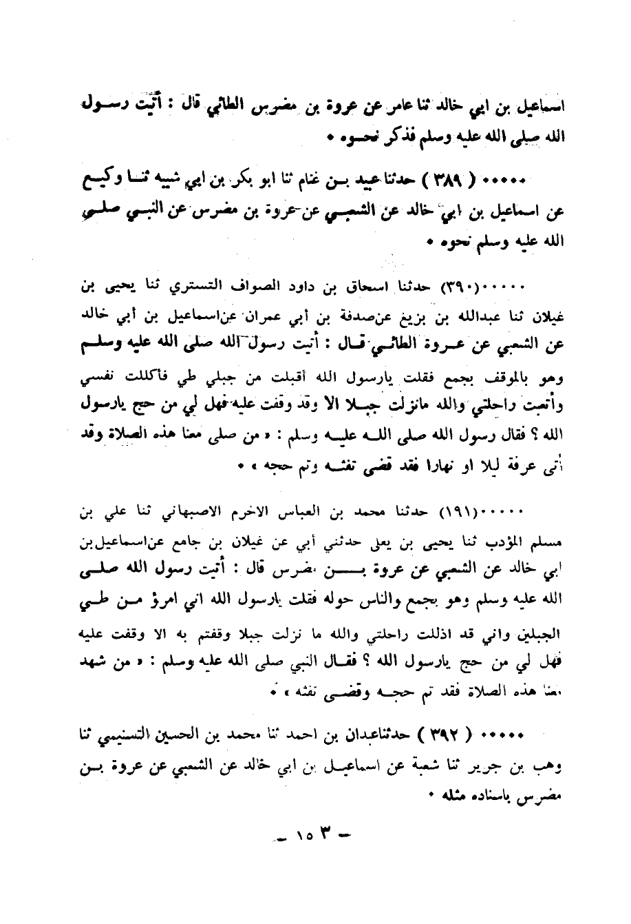 390 - حَدَّثَنَا إِسْحَاقُ بْنُ دَاوُدَ الصَّوَّافُ التُّسْتَرِيُّ، ثَنَا يَحْيَى بْنُ غَيْلَانَ، ثَنَا عَبْدُ اللهِ بْنُ بُزَيْغٍ، عَنْ صَدَقَةَ بْنِ أَبِي عِمْرَانَ، عَنْ إِسْمَاعِيلَ بْنِ أَبِي خَالِدٍ، عَنِ الشَّعْبِيِّ، عَنْ عُرْوَةَ الطَّائِيِّ قَالَ: أَتَيْتُ رَسُولَ اللهِ صَلَّى الله عَلَيْه وَسَلَّمَ وَهُو بِالْمَوْقِفِ بِجَمْعٍ فَقُلْتُ: يَا رَسُولَ اللهِ، أَقْبَلَتُ مِن جَبَلَيْ طَيِّئٍ فَأَكْلَلْتُ نَفْسِي وَأَتْعَبْتُ رَاحِلَتِي وَاللهِ مَا نَزَلْتُ جَبَلًا إِلَّا وَقَدْ وَقَفْتُ عَلَيْه فَهَل لِي مِن حَجٍّ يَا رَسُولَ اللهِ؟ فَقَالَ رَسُولُ اللهِ صَلَّى الله عَلَيْه وَسَلَّمَ: «§مَنْ صَلَّى مَعَنَا هَذِه الصَّلَاةَ وَقَدْ أَتَى عَرَفَةَ لَيْلًا أَو نَهَارًا فَقَدْ قَضَى تَفَثَهُ وَتَمّ حَجُّهُ»