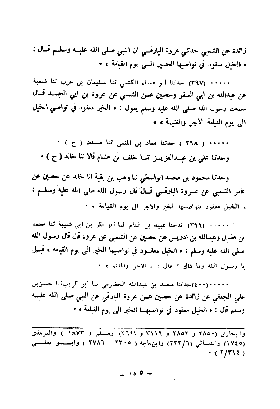 398 - حَدَّثَنَا مُعَاذُ بْنُ الْمُثَنَّى، ثَنَا مُسَدَّدٌ، ح وَحَدَّثَنَا عَلِيُّ بْنُ عَبْدِ الْعَزِيزِ، ثَنَا خَلَفُ بْنُ هِشَامٍ قَالَا: ثَنَا خَالِدٌ، ح وَحَدَّثَنَا مَحْمُودُ بْنُ مُحَمَّدٍ الْوَاسِطِيُّ، ثَنَا وَهْبُ بْنُ بَقِيَّةَ، أَنَا خَالِدٌ، عَنِ حُصَيْنِ، عَنْ عَامِرٍ الشَّعْبِيِّ، عَنْ عُرْوَةَ الْبَارِقِيِّ، قَالَ: قَالَ رَسُولُ اللهِ صَلَّى الله عَلَيْه وَسَلَّمَ: «§الْخَيْلُ مَعْقُودٌ بِنَوَاصِيهَا الْخَيْرُ وَالْأجْرُ إِلَى يَوْمِ الْقِيَامَةِ»