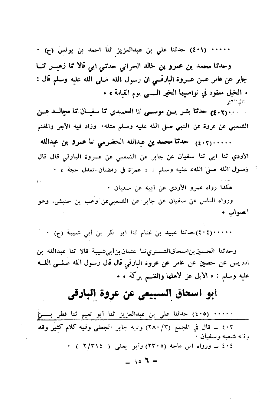 405 - حَدَّثَنَا عَلِيُّ بْنُ عَبْدِ الْعَزِيزِ، ثَنَا أَبُو نُعَيْمٍ، ثَنَا فِطْرُ بْنُ خَلِيفَةَ، عَنْ أَبِي إِسْحَاقَ، قَالَ: وَقَفَ عَلَيْنَا عُرْوَةُ الْبَارِقِيُّ وَنَحْن فِي مَجْلِسِنَا فَحَدَّثَنَا قَالَ: سَمِعْتُ رَسُولَ اللهِ صَلَّى الله عَلَيْه وَسَلَّمَ يَقُولُ: «§الْخَيْلُ مَعْقُودٌ فِي نَوَاصِيهَا الْخَيْرُ إِلَى يَوْمِ الْقِيَامَةِ»