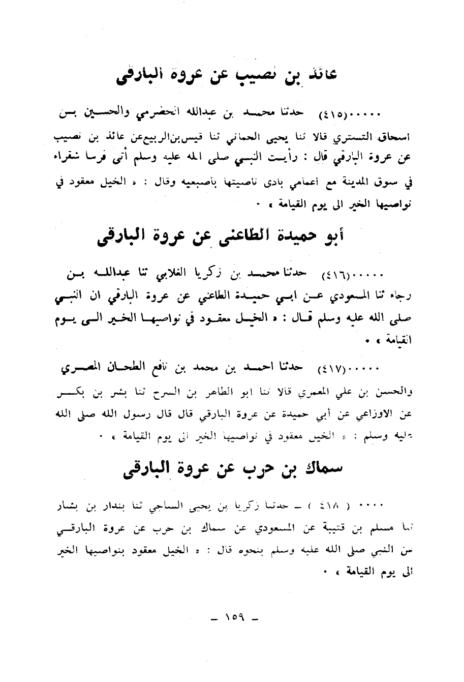 416 - حَدَّثَنَا مُحَمَّدُ بْنُ زَكَرِيَّا الْغَلَابِيُّ، ثَنَا عَبْدُ اللهِ بْنُ رَجَاءٍ، ثَنَا الْمَسْعُودِيُّ، عَنْ أَبِي حُمَيْدَةَ الطَّاعِنِيِّ، عَنْ عُرْوَةَ الْبَارِقِيِّ، أَنَّ النَّبِيَّ صَلَّى اللهُ عَلَيْهِ وَسَلَّمَ قَالَ: «§الْخَيْلُ مَعْقُودٌ فِي نَوَاصِيهَا الْخَيْرُ إِلَى يَوْمِ الْقِيَامَةِ»