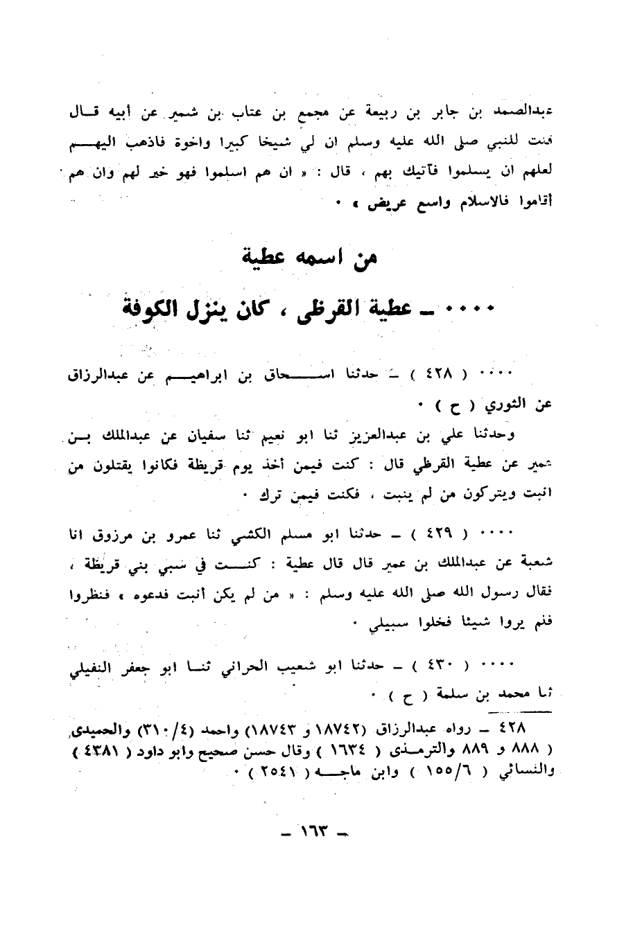 428 - حَدَّثَنَا إِسْحَاقُ بْنُ إِبْرَاهِيمَ، عَنْ عَبْدِ الرَّزَّاقِ، عَنِ الثَّوْرِيِّ، ح وَحَدَّثَنَا عَلِيُّ بْنُ عَبْدِ الْعَزِيزِ، ثَنَا أَبُو نُعَيْمٍ، ثَنَا سُفْيَانُ، عَنْ عَبْدِ الْمَلِكِ بْنِ عُمَيْرٍ، عَنْ عَطِيَّةَ الْقُرَظِيِّ، قَالَ: كُنْتُ فِيمَنْ أُخِذَ يَوْمَ قُرَيْظَةَ فَكَانُوا «§يَقْتُلُونَ مَنْ أَنَبْتَ وَيَتْرُكُونَ مَنْ لَمْ يُنْبِتْ، فَكُنْتُ فِيمَنْ تُرِكَ»
