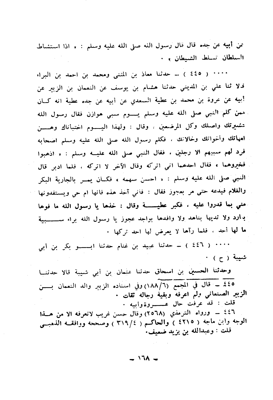 445 - حَدَّثَنَا مُعَاذُ بْنُ الْمُثَنَّى، وَمُحَمَّدُ بْنُ أَحْمَدَ بْنِ الْبَرَاءِ قَالَا: ثَنَا عَلِيُّ بْنُ الْمَدِينِيِّ، حَدَّثَنَا هِشَامُ بْنُ يُوسُفَ، عَنِ النُّعْمَانِ بْنِ الزُّبَيْرِ، عَنْ أَبِيهِ، عَنْ عُرْوَةَ بْنِ مُحَمَّدِ بْنِ عَطِيَّةَ السَّعْدِيِّ، عَنْ أَبِيهِ، عَنْ جَدِّهِ عَطِيَّةَ أَنَّهُ كَانَ مِمَّنْ كَلَّمَ النَّبِيَّ صَلَّى اللهُ عَلَيْهِ وَسَلَّمَ يَوْمَ سَبْيِ هَوَازِنَ، فَقَالَ رَسُولُ اللهِ: «§عَشِيرَتُكَ وَأَصْلُكَ وَكُلُّ الْمُرْضَعِينَ» وَقَالَ: «وَلِهَذَا الْيَوْمِ اخْتَبَأْنَاكَ وَهُنَّ أُمَّهاتُكَ وأَخَواتُكَ وخَالَاتُكَ» فَكَلَّمَ رَسُولُ اللهِ صَلَّى اللهُ عَلَيْهِ وَسَلَّمَ أَصْحَابَهُ، فَرَدَّ لَهُمْ سَبْيَهُمْ إِلَّا رَجُلَيْنِ، فَقَالَ النَّبِيُّ صَلَّى اللهُ عَلَيْهِ وَسَلَّمَ: «اذْهَبُوا فَخَيِّرُوهُمَا» فَقَالَ أَحَدُهُمَا: إنِّي أَتْرُكُهُ، وَقَالَ الْآخَرُ: لَا أَتْرُكُهُ، فَلَمَّا أَدْبَرَ قَالَ النَّبِيُّ صَلَّى اللهُ عَلَيْهِ وَسَلَّمَ: «أَحْسَنَ سَهْمَهُ» فَكَانَ يَمُرُّ بِالْجَارِيَةِ الْبِكْرِ وَالْغُلَامِ فَيَدَعُهُ حَتَّى مَرَّ بِعَجُوزٍ فَقَالَ: «فَإِنِّي آخِذٌ هَذِهِ فَإِنَّهَا أُمٌّ حَيٍّ وَيَسْتَفْدُونَهَا مِنِّي بِمَا قَدَرُوا عَلَيْهِ» فَكَبَّرَ عَطِيَّةُ وَقَالَ: خُذْهَا يَا رَسُولَ اللهِ، مَا فُوهَا بِبَارِدٍ وَلَا ثَدْيُهَا بِنَاهِدٍ، وَلَا وَافِدُها بواجِدٍ، عَجُوزٌ يَا رَسُولَ اللهِ، بَرَاءُ سَبِيَّةٌ مَا لَهَا أَحَدٌ، فَلَمَّا رَآهَا لَا يَعْرِضُ لَهَا أَحَدٌ تَرَكَهَا "