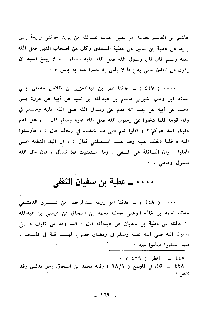 447 - حَدَّثَنَا عُمَرُ بْنُ عَبْدِ الْعَزِيزِ بْنِ مِقْلَاصٍ، حَدَّثَنِي أَبِي، حَدَّثَنَا ابْنُ وَهْبٍ، أَخْبَرَنِي عَاصِمُ بْنُ عَبْدِ اللهِ بْنِ تَمِيمٍ، عَنْ أَبِيهِ، عَنْ عُرْوَةَ بْنِ مُحَمَّدٍ، عَنْ أَبِيهِ، عَنْ جَدِّهِ، أَنَّهُ قَدِمَ عَلَى رَسُولِ اللهِ صَلَّى اللهُ عَلَيْهِ وَسَلَّمَ فِي وَفْدِ قَوْمِهِ، فَلَمَّا دَخَلُوا عَلَى رَسُولِ اللهِ صَلَّى اللهُ عَلَيْهِ وَسَلَّمَ قَالَ: «هَلْ قَدِمَ عَلَيْكُمْ أَحَدٌ غَيْرُكُمْ؟» قَالُوا: نَعَمْ، فَتًى مِنَّا خَلَّفْنَاهُ فِي رِحَالِنَا قَالَ: «فَأَرْسِلُوا إِلَيْهِ» فَلَمَّا دَخَلْتُ عَلَيْهِ وَهُمْ عِنْدَهُ اسْتَقْبَلَنِي فَقَالَ: «إِنَّ §الْيَدَ المُنْطِيَةُ هِيَ الْعُلْيَا، وَإِنَّ السَّائِلَةَ هِيَ السُّفْلَى، وَمَا اسْتَغْنَيْتَ فَلَا تَسْأَلْ، فَإِنَّ مَالَ اللهِ مَسْئُولٌ وَمُنْطًى»