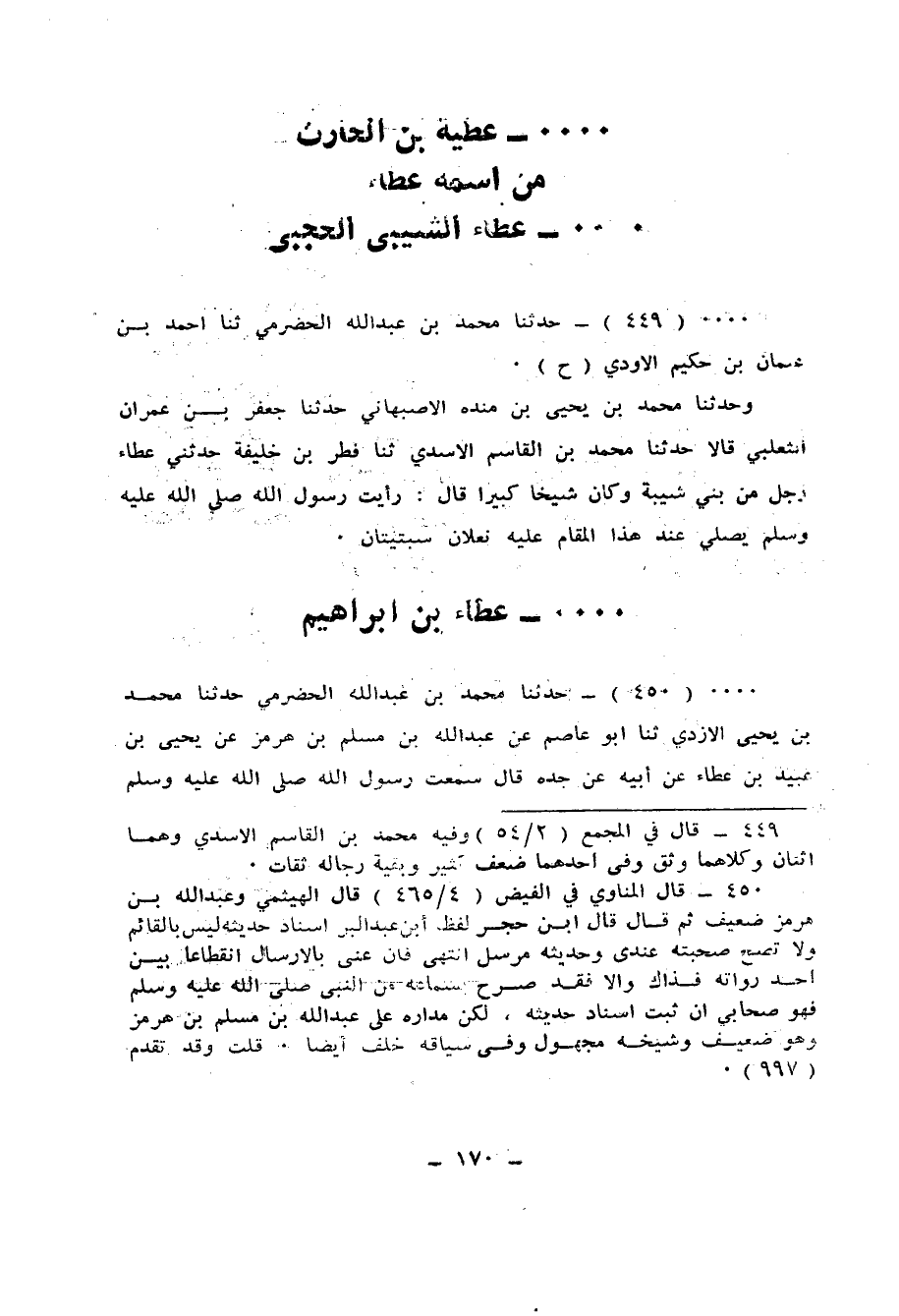 449 - حَدَّثَنَا مُحَمَّدُ بْنُ عَبْدِ اللهِ الْحَضْرَمِيُّ، ثَنَا أَحْمَدُ بْنُ عُثْمَانَ بْنِ حَكِيمٍ الْأَوْدِيُّ، ح وَحَدَّثَنَا مُحَمَّدُ بْنُ يَحْيَى بْنِ مَنْدَهْ الْأَصْبَهانِيُّ، حَدَّثَنَا جَعْفَرُ بْنُ عِمْرَانَ الثَّعْلَبِيُّ قَالَا: حَدَّثَنَا مُحَمَّدُ بْنُ الْقَاسِمِ الْأَسَدِيُّ، ثَنَا فِطْرُ بْنُ خَلِيفَةَ، حَدَّثَنِي عَطَاءٌ، رَجُلٌ مِنْ بَنِي شَيْبَةَ وَكَانَ شَيْخًا كَبِيرًا قَالَ: «رَأَيْتُ رَسُولَ اللهِ صَلَّى اللهُ عَلَيْهِ وَسَلَّمَ §يُصَلِّي عِنْدَ هَذَا الْمَقَامِ عَلَيْهِ نَعْلَانِ سِبْتِيَّتَانِ»