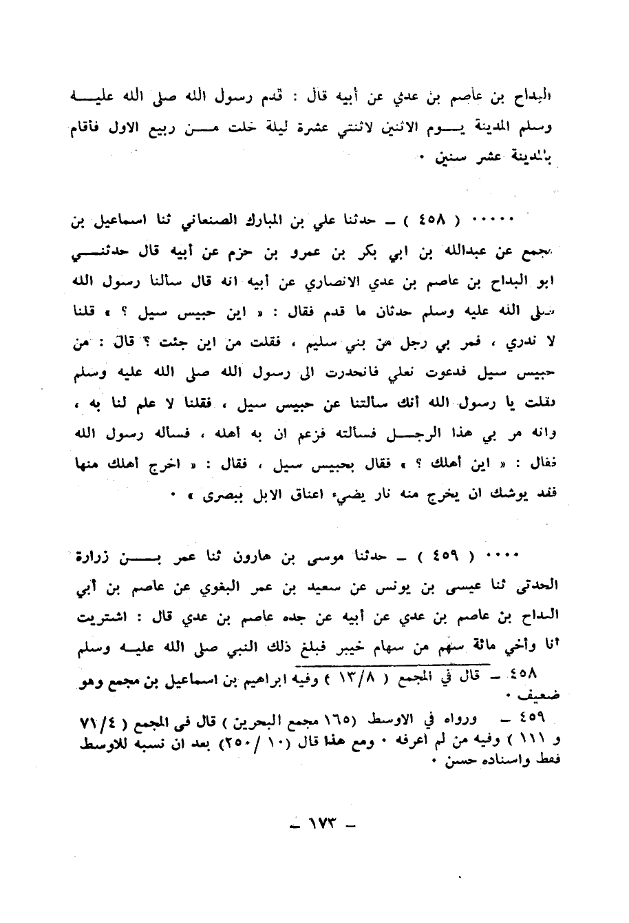458 - حَدَّثَنَا عَلِيُّ بْنُ الْمُبَارَكِ الصَّنْعَانِيُّ، ثَنَا إِسْمَاعِيلُ بْنُ مُجَمِّعٍ، عَنْ عَبْدِ اللهِ بْنِ أَبِي بَكْرِ بْنِ عَمْرِو بْنِ حَزْمٍ، عَنْ أَبِيهِ قَالَ: حَدَّثَنِي أَبُو الْبَدَّاحِ بْنُ عَاصِمِ بْنِ عَدِيٍّ الْأَنْصَارِيُّ، عَنْ أَبِيهِ، أَنَّهُ قَالَ: سَأَلْنَا رَسُولَ اللهِ صَلَّى اللهُ عَلَيْهِ وَسَلَّمَ حِدْثَانَ مَا قَدِمَ، فَقَالَ: أَيْنْ حَبِيسُ سَيْلٍ؟ قُلْنَا: لَا نَدْرِي، فَمَرَّ بِي رَجُلٌ مِنْ بَنِي سُلَيْمٍ فَقُلْتُ: مِنْ أَيْنَ جِئْتَ؟ قَالَ: مِنْ حَبِيسِ سَيْلٍ، فَدَعَوْتُ نَعْلِي فَانْحَدَرَتْ إِلَى رَسُولِ اللهِ صَلَّى اللهُ عَلَيْهِ وَسَلَّمَ فَقُلْتُ: يَا رَسُولَ اللهِ، إِنَّكَ سَأَلْتَنَا عَنْ حَبِيسِ سَيْلٍ فَقُلْنَا: لَا عَلِمَ لَنَا بِهِ، وَإِنَّهُ مَرَّ بِي هَذَا الرَّجُلُ فَسَأَلْتُهُ فَزَعَمَ أَنَّ بِهِ أَهْلَهُ، فَسَأَلَهُ رَسُولُ اللهِ فَقَالَ: «أَيْنَ أَهْلُكَ؟» فَقَالَ: بِحَبِيسِ سَيْلٍ فَقَالَ: «أَخْرِجْ أَهْلَكَ مِنْهَا، فَقَدْ يُوشِكُ أَنْ §يَخرُجَ مِنْهُ نَارٌ يُضِيءُ أَعْنَاقَ الْإِبِلِ بِبُصْرَى»