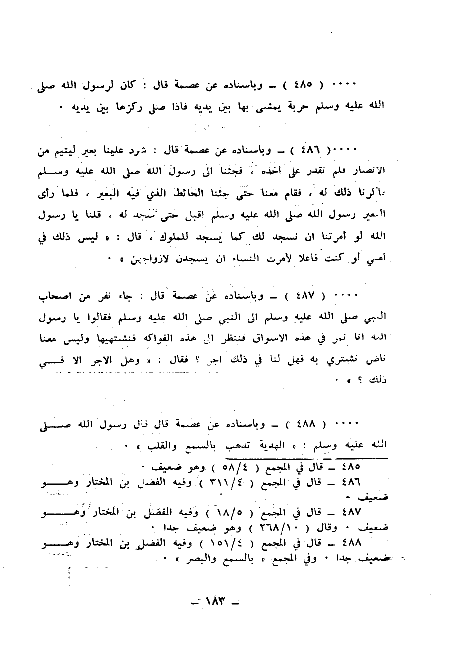 486 - وَبِإِسْنَادِهِ، عَنْ عِصْمَةَ قَالَ: شَرَدَ عَلَيْنَا بَعِيرٌ لِيَتِيمٍ مِنَ الْأَنْصَارِ فَلَمْ نَقْدِرْ عَلَى أَخْذِهِ، فَجِئْنَا إِلَى رَسُولِ اللهِ صَلَّى اللهُ عَلَيْهِ وَسَلَّمَ فَذَكَرْنَا ذَلِكَ لَهُ فَقَامَ مَعَنَا حَتَّى جِئْنَا الْحَائِطَ الَّذِي فِيهِ الْبَعِيرُ، فَلَمَّا رَأَى الْبَعِيرُ رَسُولَ اللهِ صَلَّى اللهُ عَلَيْهِ وَسَلَّمَ أَقْبَلَ حَتَّى سَجَدَ لَهُ، قُلْنَا: يَا رَسُولَ اللهِ، لَوْ أَمَرْتَنَا أَنْ نَسْجُدَ لَكَ كَمَا يُسْجَدُ لِلْمُلُوكِ قَالَ: «§لَيْسَ ذَلِكَ فِي أُمَّتِي، لَوْ كُنْتُ فَاعِلًا لَأَمَرْتُ النِّسَاءَ أَنْ يَسْجُدْنَ لِأَزْوَاجِهِنَّ»