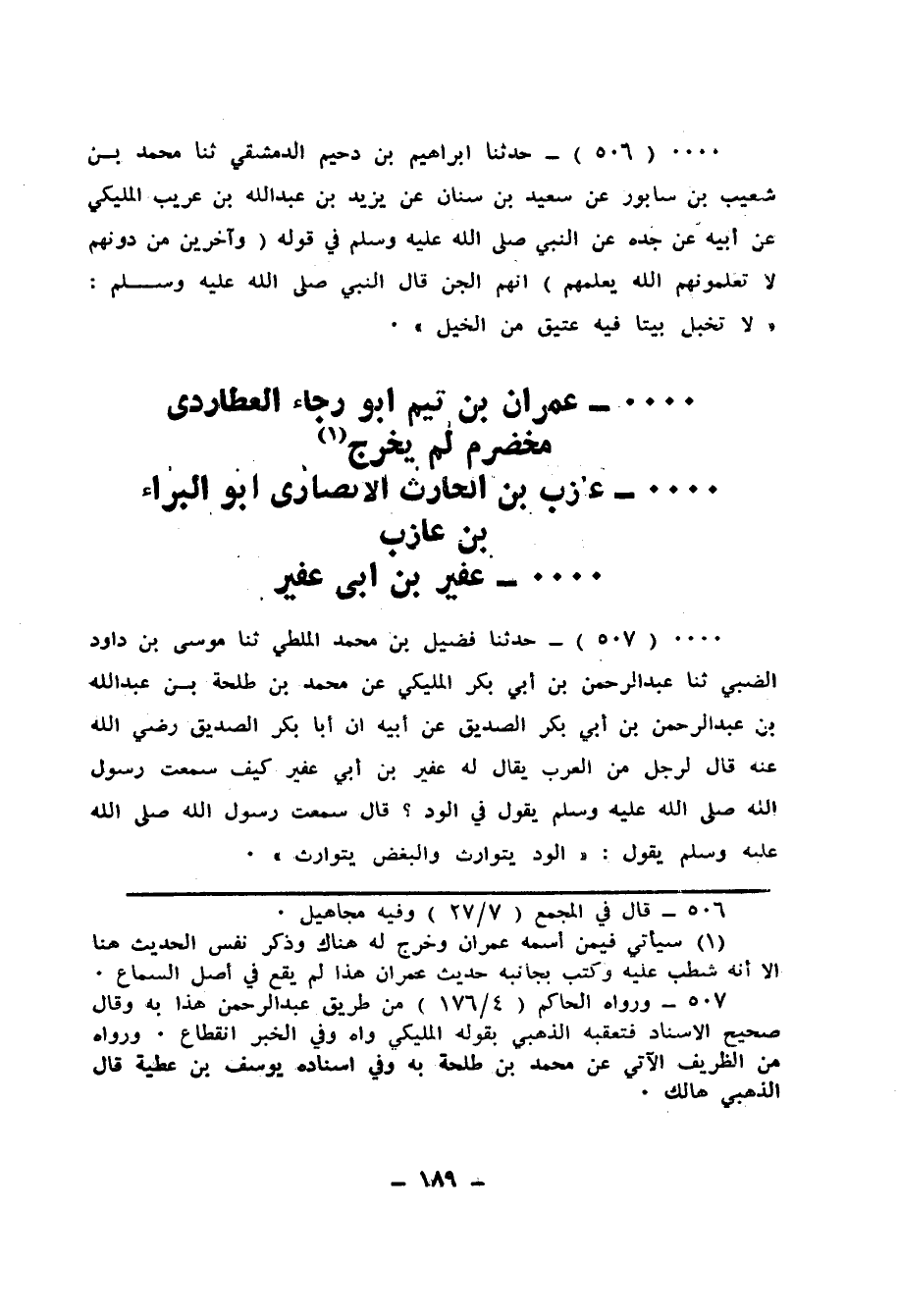 506 - حَدَّثَنَا إِبْرَاهِيمُ بْنُ دُحَيْمٍ الدِّمَشْقِيُّ، ثَنَا مُحَمَّدُ بْنُ شُعَيْبِ بْنِ شَابُورَ، عَنْ سَعِيدِ بْنِ سِنَانٍ، عَنْ يَزِيدَ بْنِ عَبْدِ اللهِ بْنِ عَرِيبٍ الْمُلَيْكِيِّ، عَنْ أَبِيهِ، عَنْ جَدِّهِ، عَنِ النَّبِيِّ صَلَّى اللهُ عَلَيْهِ وَسَلَّمَ فِي قَوْلِهِ: {وَآخَرِينَ مِنْ دُونِهِمْ لَا تَعْلَمُونَهُمُ اللهُ يَعْلَمُهُمْ} [الأنفال: 60] أَنَّهُمْ الْجِنُّ، قَالَ النَّبِيُّ صَلَّى اللهُ عَلَيْهِ وَسَلَّمَ: «§لَا تَخْبِلُ بَيْتًا فِيهِ عَتِيقٌ مِنَ الْخَيْلِ»