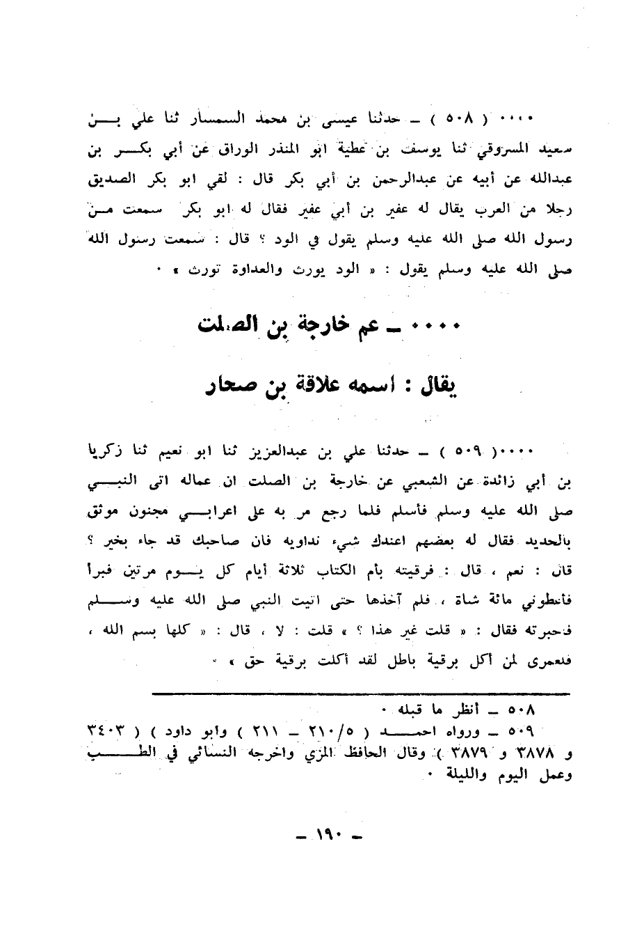 509 - حَدَّثَنَا عَلِيُّ بْنُ عَبْدِ الْعَزِيزِ، ثَنَا أَبُو نُعَيْمٍ، ثَنَا زَكَرِيَّا بْنُ أَبِي زَائِدَةَ، عَنِ الشَّعْبِيِّ، عَنْ خَارِجَةَ بْنِ الصَّلْتِ، أَنَّ عَمًّا لَهُ أَتَى النَّبِيَّ صَلَّى اللهُ عَلَيْهِ وَسَلَّمَ فَأَسْلَمَ، فَلَمَّا رَجَعَ مَرَّ بِهِ عَلَى أَعْرَابِيٍّ مَجْنُونٍ مُوثَقٍ بِالْحَدِيدِ فَقَالَ لَهُ بَعْضُهُمْ: أَعِنْدَكَ شَيْءٌ نُدَاوِيهِ فَإِنَّ صَاحِبَكَ قَدْ جَاءَ بِخَيْرٍ؟ قَالَ: نَعَمْ، قَالَ: فَرَقَيْتُهُ بِأُمِّ الْكِتَابِ ثَلَاثَةَ أَيَّامٍ كُلَّ يَوْمٍ مَرَّتَيْنِ فَبَرَأَ فَأَعْطَوْنِي مِائَةَ شَاةٍ، فَلَمْ آخُذْهَا حَتَّى أَتَيْتُ النَّبِيَّ صَلَّى اللهُ عَلَيْهِ وَسَلَّمَ فَأَخْبَرْتُهُ، فَقَالَ: قُلْتَ غَيْرَ هَذَا؟ قُلْتُ: لَا قَالَ: «§كُلْهَا بِاسْمِ اللهِ، فَلَعَمْرِي لَمَنْ أَكَلَ بِرُقْيَةِ بَاطِلٍ، لَقَدْ أَكَلْتَ بِرُقْيَةِ حَقٍّ»
