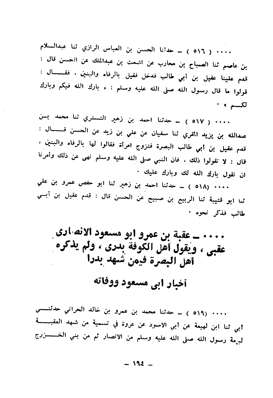 516 - حَدَّثَنَا الْحَسَنُ بْنُ الْعَبَّاسِ الرَّازِيُّ، ثَنَا عَبْدُ السَّلَامِ بْنُ عَاصِمٍ، ثَنَا الصَّبَّاحُ بْنُ مُحَارِبٍ، عَنْ أَشْعَثَ بْنِ عَبْدِ الْمَلِكِ، عَنِ الْحَسَنِ، قَالَ: قَدِمَ عَلَيْنَا عَقِيلُ بْنُ أَبِي طَالِبٍ فَدَخَلَ فَقِيلَ: بِالرِّفَاءِ وَالْبَنِينَ فَقَالَ: قُولُوا مَا قَالَ رَسُولُ اللهِ صَلَّى اللهُ عَلَيْهِ وَسَلَّمَ: «§بَارَكَ اللهُ فِيكُمْ وَبَارَكَ لَكُمْ»