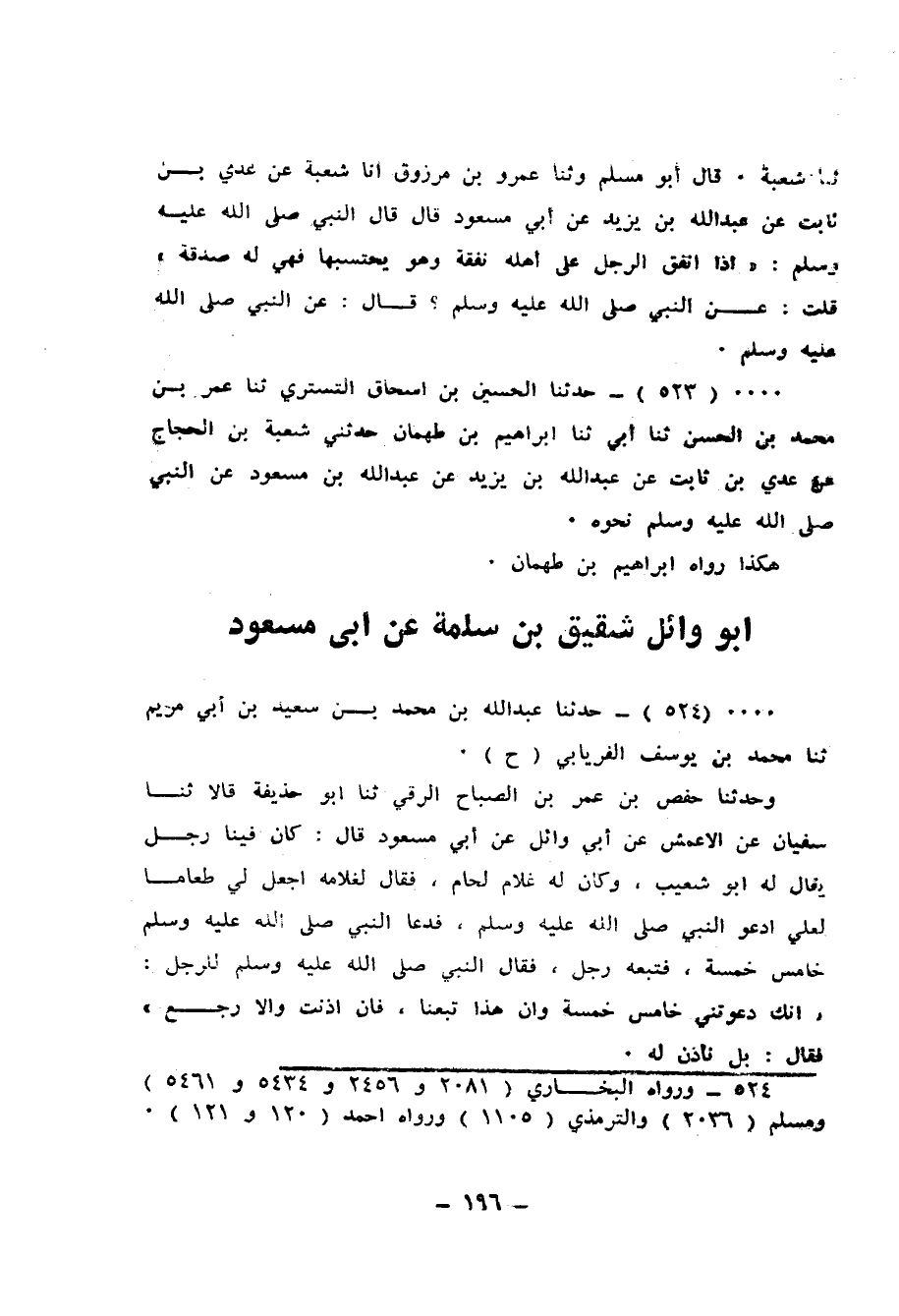 524 - حَدَّثَنَا عَبْدُ اللهِ بْنُ مُحَمَّدِ بْنِ سَعِيدِ بْنِ أَبِي مَرْيَمَ، ثَنَا مُحَمَّدُ بْنُ يُوسُفَ الْفِرْيَابِيُّ، ح وَحَدَّثَنَا حَفْصُ بْنُ عُمَرَ بْنِ الصَّبَّاحِ الرَّقِّيُّ، ثَنَا أَبُو حُذَيْفَةَ قَالَا: ثَنَا سُفْيَانُ، عَنِ الْأَعْمَشِ، عَنْ أَبِي وَائِلٍ، عَنْ أَبِي مَسْعُودٍ قَالَ: كَانَ فِينَا رَجُلٌ يُقَالُ لَهُ: أَبُو شُعَيْبٍ وَكَانَ لَهُ غُلَامٌ لَحَّامٌ فَقَالَ لِغُلَامِهِ: اجْعَلْ لِي طَعَامًا لَعَلِّي أَدْعُو النَّبِيَّ صَلَّى اللهُ عَلَيْهِ وَسَلَّمَ، فَدَعَا النَّبِيَّ صَلَّى اللهُ عَلَيْهِ وَسَلَّمَ خَامِسَ خَمْسَةٍ فَتَبِعَهُ رَجُلٌ، فَقَالَ النَّبِيُّ صَلَّى اللهُ عَلَيْهِ وَسَلَّمَ لِلرَّجُلِ: «إِنَّكَ §دَعَوْتَنِي خَامِسَ خَمْسَةٍ وَإِنَّ هَذَا تَبِعَنَا، فَإِنْ أَذِنْتَ وَإِلَّا رَجَعَ» فَقَالَ: بَلْ نَأْذَنُ لَهُ