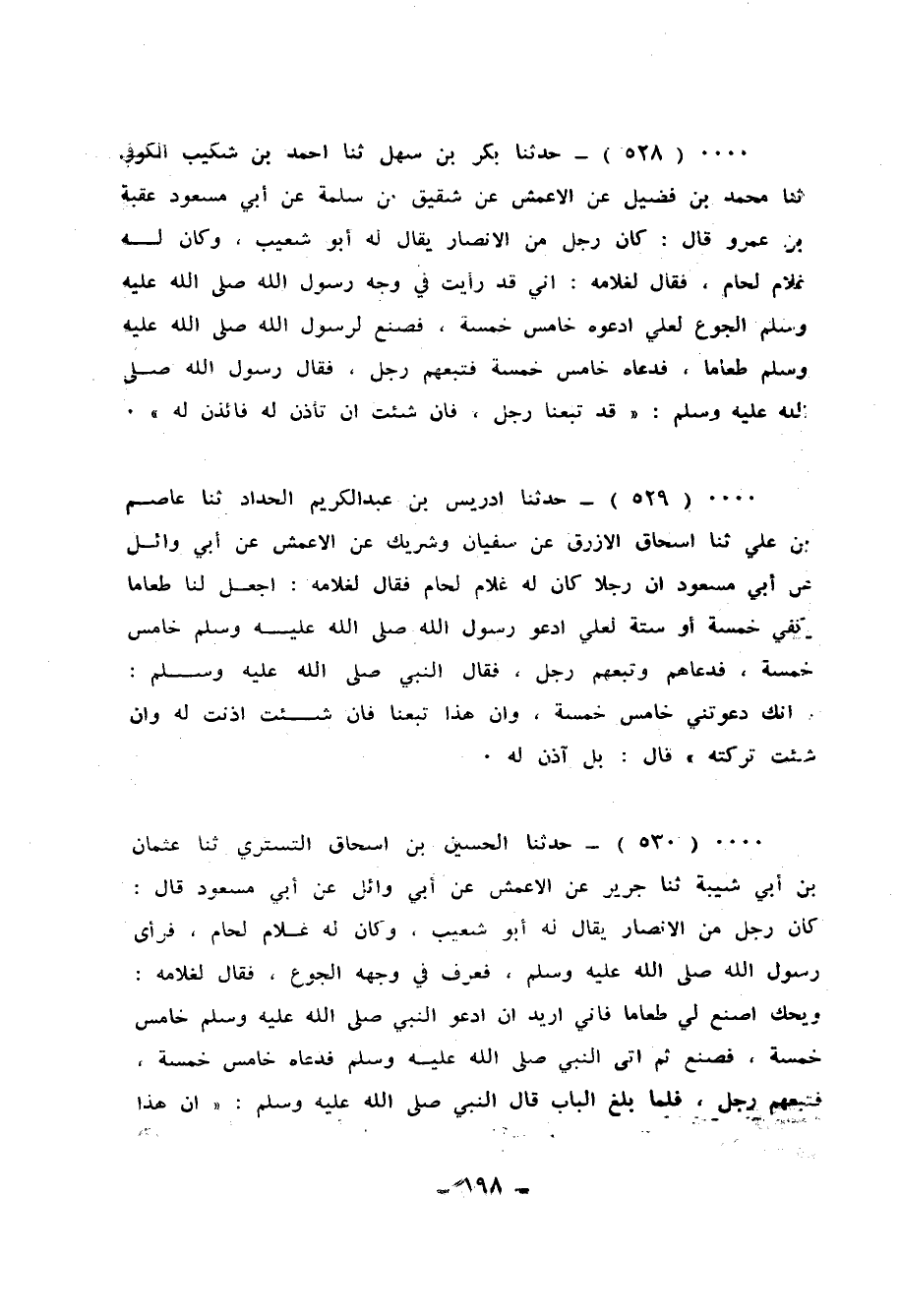 530 - حَدَّثَنَا الْحُسَيْنُ بْنُ إِسْحَاقَ التُّسْتَرِيُّ، ثَنَا عُثْمَانُ بْنُ أَبِي شَيْبَةَ، ثَنَا جَرِيرٌ، عَنِ الْأَعْمَشِ، عَنْ أَبِي وَائِلٍ، عَنْ أَبِي مَسْعُودٍ قَالَ: كَانَ رَجُلٌ مِنَ الْأَنْصَارِ يُقَالُ لَهُ: أَبُو شُعَيْبٍ وَكَانَ لَهُ غُلَامٌ لَحَّامٌ فَرَأَى رَسُولَ اللهِ صَلَّى اللهُ عَلَيْهِ وَسَلَّمَ فَعَرَفَ فِي وَجْهِهِ الْجُوعَ، فَقَالَ لِغُلَامِهِ: وَيْحَكَ، اصْنَعْ لِي طَعَامًا فَإِنِّي أُرِيدُ أَنْ أَدْعُوَ النَّبِيَّ صَلَّى اللهُ عَلَيْهِ وَسَلَّمَ خَامِسَ خَمْسَةٍ، فَصَنَعَ ثُمَّ أَتَى النَّبِيَّ صَلَّى اللهُ عَلَيْهِ وَسَلَّمَ فَدَعَاهُ خَامِسَ خَمْسَةٍ فَتَبِعَهُمْ رَجُلٌ، فَلَمَّا بَلَغَ الْبَابَ قَالَ النَّبِيُّ صَلَّى اللهُ عَلَيْهِ وَسَلَّمَ: «إِنَّ §هَذَا تَبِعَنَا، فَإِنْ شِئْتَ فَائْذَنْ لَهُ وَإِنْ شِئْتَ رَجَعَ» قَالَ: لَا بَلْ آذَنُ لَهُ يَا رَسُولَ اللهِ