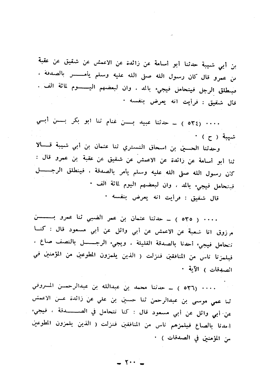 536 - حَدَّثَنَا مُحَمَّدُ بْنُ عَبْدِ اللهِ بْنِ عَبْدِ الرَّحْمَنِ الْمَسْرُوقِيُّ، ثَنَا عَمِّي مُوسَى بْنُ عَبْدِ الرَّحْمَنِ، ثَنَا حُسَيْنُ بْنُ عَلِيٍّ، عَنْ زَائِدَةَ، عَنِ الْأَعْمَشِ، عَنْ أَبِي وَائِلٍ، عَنْ أَبِي مَسْعُودٍ قَالَ: " §كُنَّا نَتَحَامَلُ فِي الصَّدَقَةِ فَيَجِيءُ أَحَدُنَا بِالصَّاعِ، فَيَلْمِزُهُمْ نَاسٌ مِنَ الْمُنَافِقِينَ، فَنَزَلَتْ {الَّذِينَ يَلْمِزُونَ الْمُطَّوِّعِينَ مِنَ الْمُؤْمِنِينَ فِي الصَّدَقَاتِ} [التوبة: 79] "