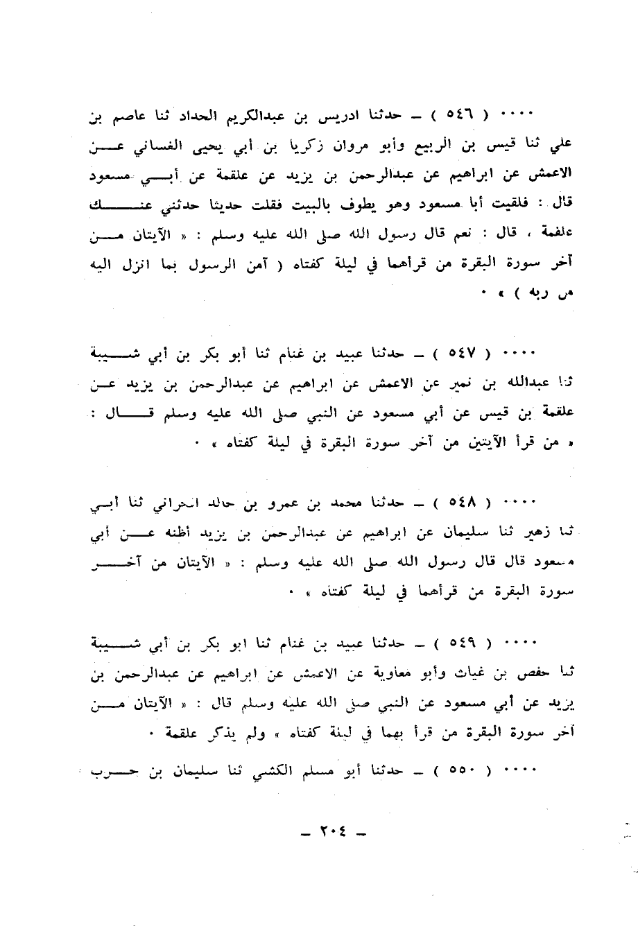 546 - حَدَّثَنَا إِدْرِيسُ بْنُ عَبْدِ الْكَرِيمِ الْحَدَّادُ، ثَنَا عَاصِمُ بْنُ عَلِيٍّ، ثَنَا قَيْسُ بْنُ الرَّبِيعِ، وَأَبُو مَرْوَانَ زَكَرِيَّا بْنُ أَبِي يَحْيَى الْغَسَّانِيُّ، عَنِ الْأَعْمَشِ، عَنْ إِبْرَاهِيمَ، عَنْ عَبْدِ الرَّحْمَنِ بْنِ يَزِيدَ، عَنْ عَلْقَمَةَ، عَنْ أَبِي مَسْعُودٍ - قَالَ: فَلَقِيتُ أَبَا مَسْعُودٍ وَهُوَ يَطُوفُ بِالْبَيْتِ، فَقُلْتُ حَدِيثًا حَدَّثَنِي عَنْكَ عَلْقَمَةُ قَالَ: نَعَمْ - قَالَ رَسُولُ اللهِ صَلَّى اللهُ عَلَيْهِ وَسَلَّمَ: " §الْآيَتَانِ مِنْ آخِرِ سُورَةِ الْبَقَرَةِ مَنْ قَرَأَهُمَا فِي لَيْلَةٍ كَفَتَاهُ {آمَنَ الرَّسُولُ بِمَا أُنْزِلَ إِلَيْهِ مِنْ رَبِّهِ} [البقرة: 285] "