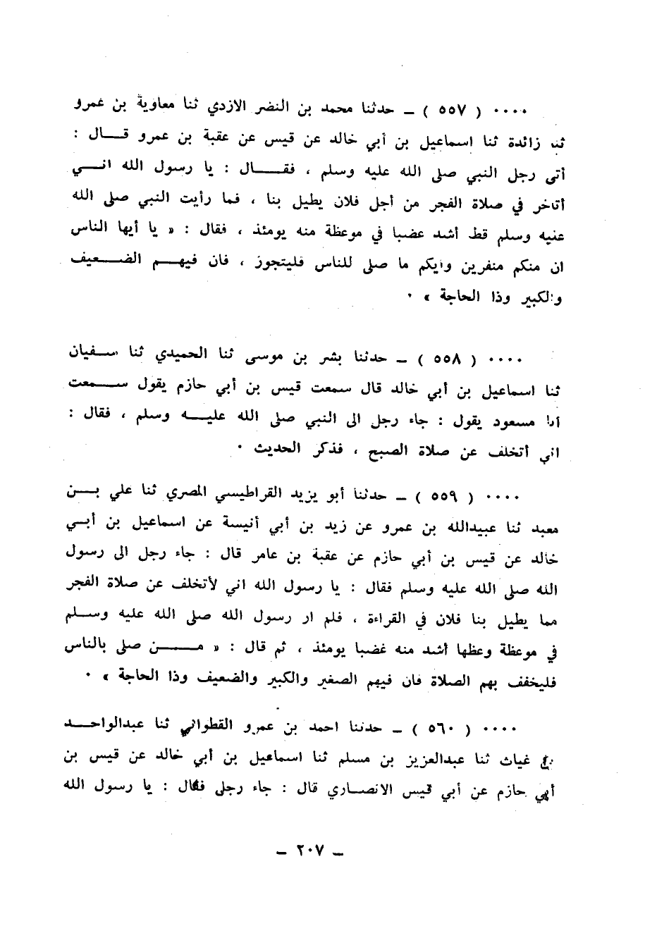 557 - حَدَّثَنَا مُحَمَّدُ بْنُ النَّضْرِ الْأَزْدِيُّ، ثَنَا مُعَاوِيَةُ بْنُ عَمْرٍو، ثَنَا زَائِدَةُ، ثَنَا إِسْمَاعِيلُ بْنُ أَبِي خَالِدٍ، عَنْ قَيْسٍ، عَنْ عُقْبَةَ بْنِ عَمْرٍو قَالَ: أَتَى رَجُلٌ النَّبِيَّ صَلَّى اللهُ عَلَيْهِ وَسَلَّمَ فَقَالَ: يَا رَسُولَ اللهِ، إنِّي أَتَأَخَّرُ فِي صَلَاةِ الْفَجْرِ مِنْ أَجْلِ فُلَانٍ يُطِيلُ بِنَا، فَمَا رَأَيْتُ النَّبِيَّ صَلَّى اللهُ عَلَيْهِ وَسَلَّمَ قَطُّ أَشَدَّ غَضَبًا فِي مَوْعِظَةٍ مِنْهُ يَوْمَئِذٍ، فَقَالَ: «يَا أَيُّهَا النَّاسُ، إِنَّ مِنْكُمْ مُنَفِّرِينَ، وَأَيُّكُمْ §مَا صَلَّى لِلنَّاسِ فَلْيَتَجَوَّزْ، فَإِنَّ فِيهِمُ الضَّعِيفَ وَالْكَبِيرَ وَذَا الْحَاجَةِ»