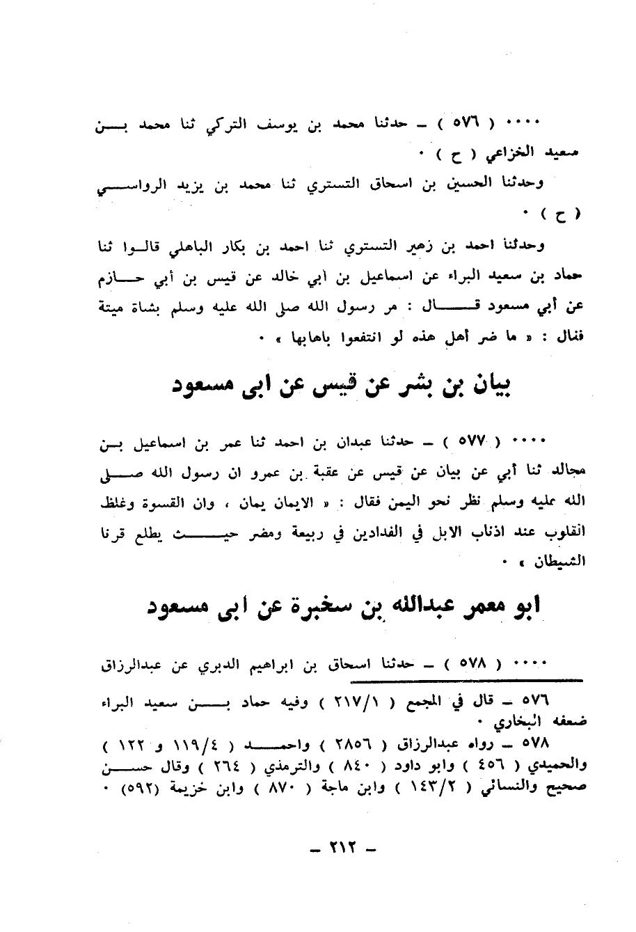 576 - حَدَّثَنَا مُحَمَّدُ بْنُ يُوسُفَ التُّرْكِيُّ، ثَنَا مُحَمَّدُ بْنُ سَعِيدٍ الْخُزَاعِيُّ، ح، وَحَدَّثَنَا الْحُسَيْنُ بْنُ إِسْحَاقَ التُّسْتَرِيُّ، ثَنَا مُحَمَّدُ بْنُ يَزِيدَ الرُّؤَاسِيُّ، ح، وَحَدَّثَنَا أَحْمَدُ بْنُ زُهَيْرٍ التُّسْتَرِيُّ، ثَنَا أَحْمَدُ بْنُ بَكَّارٍ الْبَاهِلِيُّ، قَالُوا: ثَنَا حَمَّادُ بْنُ سَعِيدٍ الْبَرَاءُ، عَنْ إِسْمَاعِيلَ بْنِ أَبِي خَالِدٍ، عَنْ قَيْسِ بْنِ أَبِي حَازِمٍ، عَنْ أَبِي مَسْعُودٍ قَالَ: مَرَّ رَسُولُ اللهِ صَلَّى اللهُ عَلَيْهِ وَسَلَّمَ بِشَاةٍ مَيْتَةٍ، فَقَالَ: «§مَا ضَرَّ أَهْلَ هَذِهِ لَوِ انْتَفَعُوا بِإِهَابِهَا»