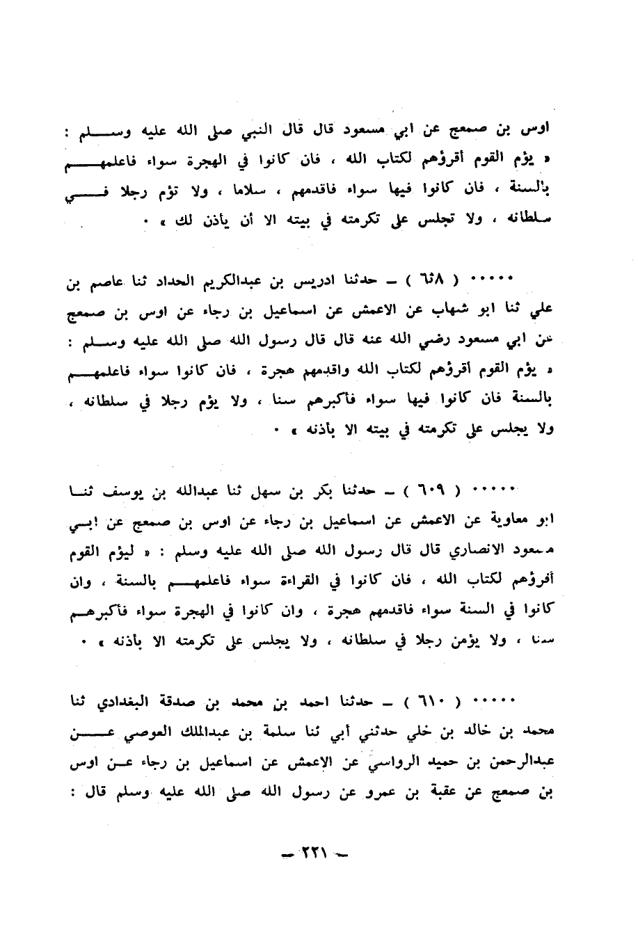 609 - حَدَّثَنَا بَكْرُ بْنُ سَهْلٍ، ثَنَا عَبْدُ اللهِ بْنُ يُوسُفَ، ثَنَا أَبُو مُعَاوِيَةَ، عَنِ الْأَعْمَشِ، عَنْ إِسْمَاعِيلَ بْنِ رَجَاءٍ، عَنْ أَوْسِ بْنِ ضَمْعَجٍ، عَنْ أَبِي مَسْعُودٍ الْأَنْصَارِيِّ قَالَ: قَالَ رَسُولُ اللهِ صَلَّى اللهُ عَلَيْهِ وَسَلَّمَ: «§لِيَؤُمَّ الْقَوْمَ أَقْرَؤُهُمْ لِكِتَابِ اللهِ، فَإِنْ كَانُوا فِي الْقِرَاءَةِ سَوَاءً فَأَعْلَمُهُمْ بِالسُّنَّةِ، وَإِنْ كَانُوا فِي السُّنَّةِ سَوَاءً فَأَقْدَمُهُمْ هِجْرَةً، وَإِنْ كَانُوا فِي الْهِجْرَةِ سَوَاءً فَأَكْبَرُهُمْ سِنًّا، وَلَا يُؤَمَّنَّ رَجُلٌ فِي سُلْطَانِهِ، وَلَا يُجْلَسُ عَلَى تَكْرِمَتِهِ إِلَّا بِإِذْنِهِ»
