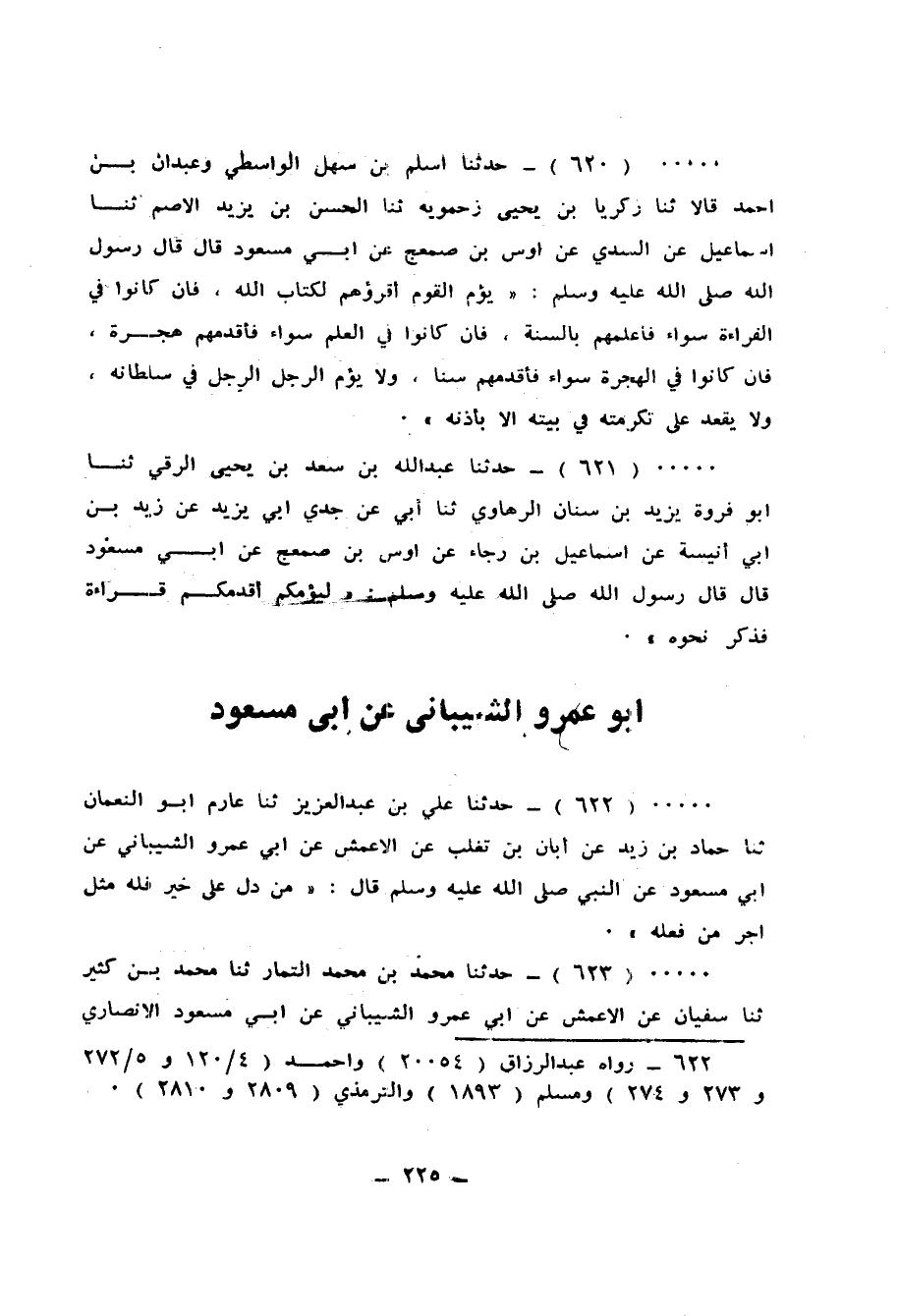 620 - حَدَّثَنَا أَسْلَمُ بْنُ سَهْلٍ الْوَاسِطِيُّ، وَعَبْدَانُ بْنُ أَحْمَدَ قَالَا: ثَنَا زَكَرِيَّا بْنُ يَحْيَى زَحْمَوَيْهِ، ثَنَا الْحَسَنُ بْنُ يَزِيدَ الْأَصَمُّ، ثَنَا إِسْمَاعِيلُ، عَنِ السُّدِّيِّ، عَنْ أَوْسِ بْنِ ضَمْعَجٍ، عَنْ أَبِي مَسْعُودٍ قَالَ: قَالَ رَسُولُ اللهِ صَلَّى اللهُ عَلَيْهِ وَسَلَّمَ: «§يَؤُمُّ الْقَوْمَ أَقْرَؤُهُمْ لِكِتَابِ اللهِ، فَإِنْ كَانُوا فِي الْقِرَاءَةِ سَوَاءً فَأَعْلَمُهُمْ بِالسُّنَّةِ، فَإِنْ كَانُوا فِي الْعِلْمِ سَوَاءً فَأَقْدَمُهُمْ هِجْرَةً، فَإِنْ كَانُوا فِي الْهِجْرَةِ سَوَاءً فَأَقْدَمُهُمْ سِنًّا، وَلَا يَؤُمُّ الرَّجُلُ الرَّجُلَ فِي سُلْطَانِهِ، وَلَا يَقْعُدُ عَلَى تَكْرِمَتِهِ فِي بَيْتِهِ إِلَّا بِإِذْنِهِ»