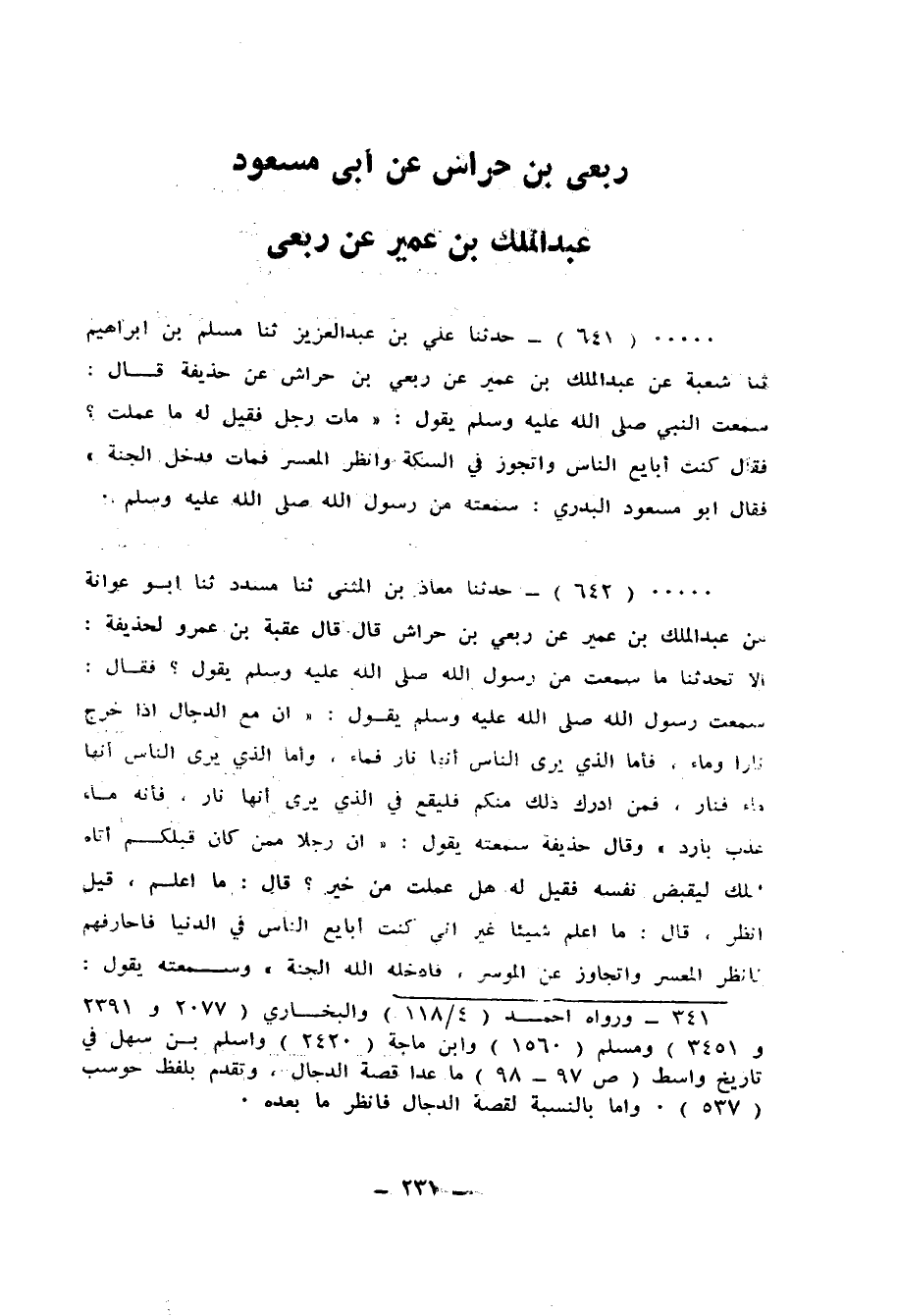 642 - حَدَّثَنَا مُعَاذُ بْنُ الْمُثَنَّى، ثَنَا مُسَدَّدٌ، ثَنَا أَبُو عَوَانَةَ، عَنْ عَبْدِ الْمَلِكِ بْنِ عُمَيْرٍ، عَنْ رِبْعِيِّ بْنِ حِرَاشٍ قَالَ: قَالَ عُقْبَةُ بْنُ عَمْرٍو لِحُذَيْفَةَ: أَلَا تُحَدِّثُنَا مَا سَمِعْتَ مِنْ رَسُولِ اللهِ صَلَّى اللهُ عَلَيْهِ وَسَلَّمَ يَقُولُ؟ فَقَالَ: سَمِعْتُ رَسُولَ اللهِ صَلَّى اللهُ عَلَيْهِ وَسَلَّمَ يَقُولُ: «إِنَّ §مَعَ الدَّجَّالِ إِذَا خَرَجَ نَارًا وَمَاءً، فَأَمَّا الَّذِي يَرَى النَّاسُ أَنَّهَا نَارٌ فَمَاءٌ، وَأَمَّا الَّذِي يَرَى النَّاسُ أَنَّهَا مَاءٌ فَنَارٌ، فَمَنْ أَدْرَكَ ذَلِكَ مِنْكُمْ فَلْيَقَعْ فِي الَّذِي يَرَى أَنَّهَا نَارٌ فَإِنَّهُ مَاءٌ عَذْبٌ بَارِدٌ» وَقَالَ حُذَيْفَةُ سَمِعْتُهُ يَقُولُ: " إِنَّ رَجُلًا مِمَّنْ كَانَ قَبْلَكُمْ أَتَاهُ الْمَلَكُ لِيَقْبِضَ نَفْسَهُ فَقِيلَ لَهُ: هَلْ عَمِلْتَ مِنْ خَيْرٍ؟ قَالَ: مَا أَعْلَمُ، قِيلَ انْظُرْ، قَالَ: مَا أعْلَمُ شَيْئًا غَيْرَ أَنِّي كُنْتُ أُبَايِعُ النَّاسَ فِي الدُّنْيَا فَأُجَازِفُهُمْ، فَأُنْظِرُ الْمُعْسِرَ وَأَتَجَاوَزُ عَنِ الْمُوسِرِ، فَأَدْخَلَهُ اللهُ الْجَنَّةَ " وَسَمِعْتُهُ يَقُولُ: " إِنَّ رَجُلًا حَضَرَهُ الْمَوْتُ، فَلَمَّا أَيِسَ مِنَ الْحَيَاةِ أَوْصَى أَهْلَهُ: إِذَا أَنَا مُتُّ فَاجْمَعُوا لِي حَطَبًا كَثِيرًا حَوْلًا، ثُمَّ انْظُرُوا يَوْمًا رَائِحًا فَذَرُونِي فِي الْيَمِّ، فَفَعَلُوا، فَجَمَعَهُ اللهُ فَقَالَ: لَمَ فَعَلْتَ ذَلِكَ؟ فَقَالَ: مِنْ خَشْيَتِكَ، فَغَفَرَ اللهُ لَهُ ". قَالَ عُقْبَةُ: وَأَنَا سَمِعْتُهُ يَقُولُ ذَلِكَ وَكَانَ. . .
