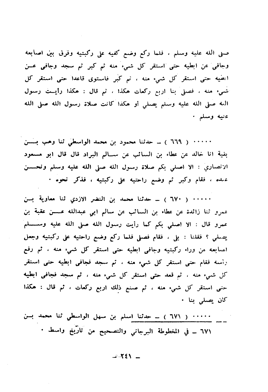 671 - حَدَّثَنَا أَسْلَمُ بْنُ سَهْلٍ الْوَاسِطِيُّ، ثَنَا مُحَمَّدُ بْنُ حَسَّانَ الْبُرْجُلَانِيُّ، ثَنَا مُحَمَّدُ بْنُ يَزِيدَ، عَنْ جَعْفَرِ بْنِ الْحَارِثِ، عَنْ عَطَاءِ بْنِ السَّائِبِ، عَنْ أَبِي عَبْدِ اللهِ، عَنْ عُقْبَةَ بْنِ عَمْرٍو، قَالَ: «§أُصَلِّي بِكُمْ صَلَاةَ رَسُولِ اللهِ صَلَّى اللهُ عَلَيْهِ وَسَلَّمَ؟» قُلْنَا: نَعَمْ، فَقَامَ فَكَبَّرَ، ثُمَّ رَكَعَ فَوَضَعَ رَاحَتَيْهِ عَلَى رُكْبَتَيْهِ وَجَعَلَ أَصَابِعَهُ أَسْفَلَ مِنْ رُكْبَتَيْهِ وَجَافَى إِبْطَيْهِ حَتَّى إِذَا اسْتَقَرَّ مِنْهُ كُلُّ شَيْءٍ مَكَانَهُ رَفَعَ، حَتَّى إِذَا اسْتَقَرَّ كُلُّ شَيْءٍ مِنْهُ سَجَدَ فَوَضَعَ كَفَّيْهِ عَلَى الْأَرْضِ، وَجَافَى بَيْنَ إِبْطَيْهِ وَرَفَعَ رَأْسَهُ، حَتَّى إِذَا اسْتَقَرَّ كُلُّ شَيْءٍ مِنْهُ عَادَ فَصَنَعَ مِثْلَ ذَلِكَ أَرْبَعَ رَكَعَاتٍ، ثُمَّ قَالَ: «هَكَذَا رَأَيْتُ رَسُولَ اللهِ صَلَّى اللهُ عَلَيْهِ وَسَلَّمَ يُصَلِّي بِنَا»