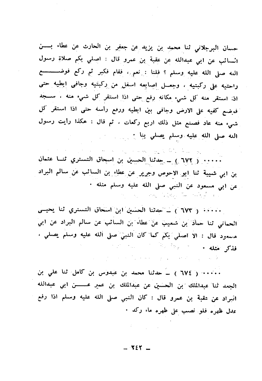 674 - حَدَّثَنَا مُحَمَّدُ بْنُ عَبْدُوسِ بْنِ كَامِلٍ، ثَنَا عَلِيُّ بْنُ الْجَعْدِ، ثَنَا عَبْدُ الْمَلِكِ بْنُ الْحُسَيْنِ، عَنْ عَبْدِ الْمَلِكِ بْنِ عُمَيْرٍ، عَنْ أَبِي عَبْدِ اللهِ الْبَرَّادِ، عَنْ عُقْبَةَ بْنِ عَمْرٍو قَالَ: «كَانَ النَّبِيُّ صَلَّى اللهُ عَلَيْهِ وَسَلَّمَ §إِذَا رَفَعَ عَدَلَ ظَهْرَهُ، فَلَوْ نُصِبَ عَلَى ظَهْرِهِ مَاءٌ رَكَدَ»