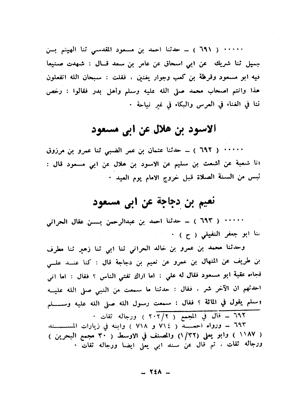 691 - حَدَّثَنَا أَحْمَدُ بْنُ مَسْعُودٍ الْمَقْدِسِيُّ، ثَنَا الْهَيْثَمُ بْنُ جَمِيلٍ، ثَنَا شَرِيكٌ، عَنْ أَبِي إِسْحَاقَ، عَنْ عَامِرِ بْنِ سَعْدٍ، قَالَ: شَهِدْتُ صَنِيعًا فِيهِ أَبُو مَسْعُودٍ وَقَرَظَةُ بْنُ كَعْبٍ، وَجَوَارٍ يُغَنِّينَ، فَقُلْتُ: سُبْحَانَ اللهِ أَتَفْعَلُونَ هَذَا وَأَنْتُمْ أَصْحَابُ مُحَمَّدٍ صَلَّى اللهُ عَلَيْهِ وَسَلَّمَ، وَأَهْلُ بَدْرٍ؟ فَقَالُوا: «§رُخِّصَ لَنَا فِي الْغِنَاءِ فِي الْعُرْسِ، وَالْبُكَاءِ فِي غَيْرِ نِيَاحَةٍ»