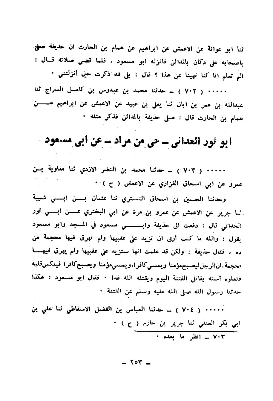 703 - حَدَّثَنَا مُحَمَّدُ بْنُ النَّضْرِ الْأَزْدِيُّ، ثَنَا مُعَاوِيَةُ بْنُ عَمْرٍو، عَنْ أَبِي إِسْحَاقَ الْفَزَارِيُّ، عَنِ الْأَعْمَشِ، ح، وَحَدَّثَنَا الْحُسَيْنُ بْنُ إِسْحَاقَ التُّسْتَرِيُّ، ثَنَا عُثْمَانُ بْنُ أَبِي شَيْبَةَ، ثَنَا جَرِيرٌ، عَنِ الْأَعْمَشِ، عَنْ عَمْرِو بْنِ مُرَّةَ، عَنْ أَبِي الْبَخْتَرِيِّ، عَنْ أَبِي ثَوْرٍ الْحُدَّانِيِّ قَالَ: دُفِعْتُ إِلَى حُذَيْفَةَ وَأَبِي مَسْعُودٍ فِي الْمَسْجِدِ، وَأَبُو مَسْعُودٍ يَقُولُ: " وَاللهِ مَا كُنْتُ أَرَى أنْ تَزِيدَ عَلَى عَقِبَيْهَا وَلَمْ تُهْرَقْ فِيهَا مِحْجَمَةٌ مِنْ دَمٍ، فَقَالَ حُذَيْفَةُ: «وَلَكِنْ قَدْ عَلِمْتُ أَنَّهَا سَتَزِيدُ عَلَى عَقِبَيْهَا وَلَمْ تُهْرَقْ فِيهَا مِحْجَمَةٌ، إِنَّ §الرَّجُلَ لَيُصْبِحُ مُؤْمِنًا، وَيُمْسِي كَافِرًا، وَيُمْسِي مُؤْمِنًا، وَيُصْبِحُ كَافِرًا، فَيُنَكَّسُ قَلْبُهُ فَتَعْلُوهُ اسْتُهُ، يُقَاتِلُ الْفِتْنَةَ الْيَوْمَ وَيَقْتُلُهُ اللهُ غَدًا» فَقَالَ أَبُو مَسْعُودٍ: «هَكَذَا حَدَّثَنَا رَسُولُ اللهِ صَلَّى اللهُ عَلَيْهِ وَسَلَّمَ عَنِ الْفِتْنَةِ»
