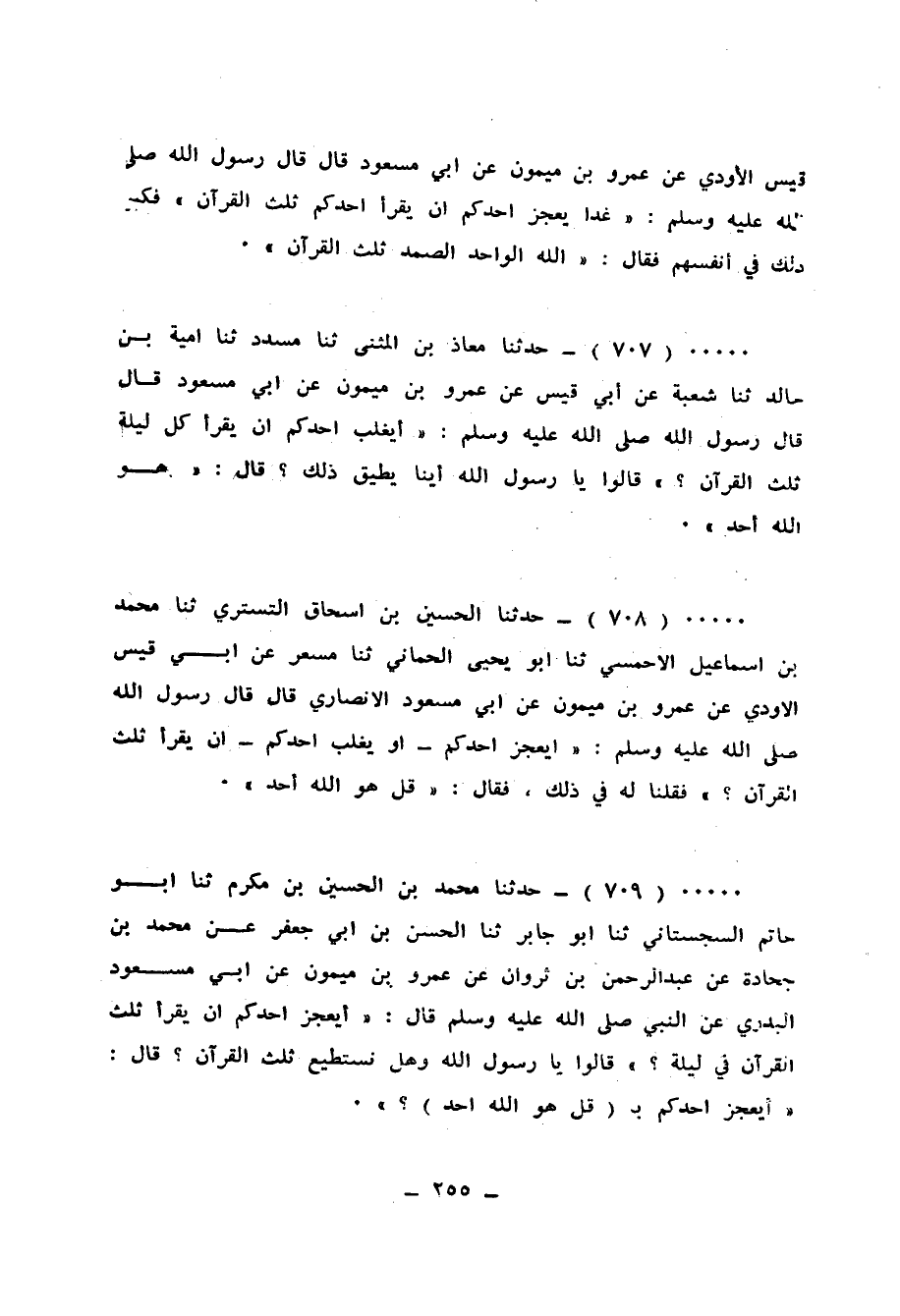 707 - حَدَّثَنَا مُعَاذُ بْنُ الْمُثَنَّى، ثَنَا مُسَدَّدٌ، ثَنَا أُمَيَّةُ بْنُ خَالِدٍ، ثَنَا شُعْبَةُ، عَنْ أَبِي قَيْسٍ، عَنْ عَمْرِو بْنِ مَيْمُونٍ، عَنْ أَبِي مَسْعُودٍ قَالَ: قَالَ رَسُولُ اللهِ صَلَّى اللهُ عَلَيْهِ وَسَلَّمَ: «§أَيُغْلَبُ أَحَدُكُمْ أنْ يَقْرَأَ كُلَّ لَيْلَةٍ ثُلُثَ الْقُرْآنِ؟» قَالُوا: يَا رَسُولَ اللهِ، أَيُّنَا يُطِيقُ ذَلِكَ؟ قَالَ: «قُلْ هُوَ اللهُ أَحَدٌ»