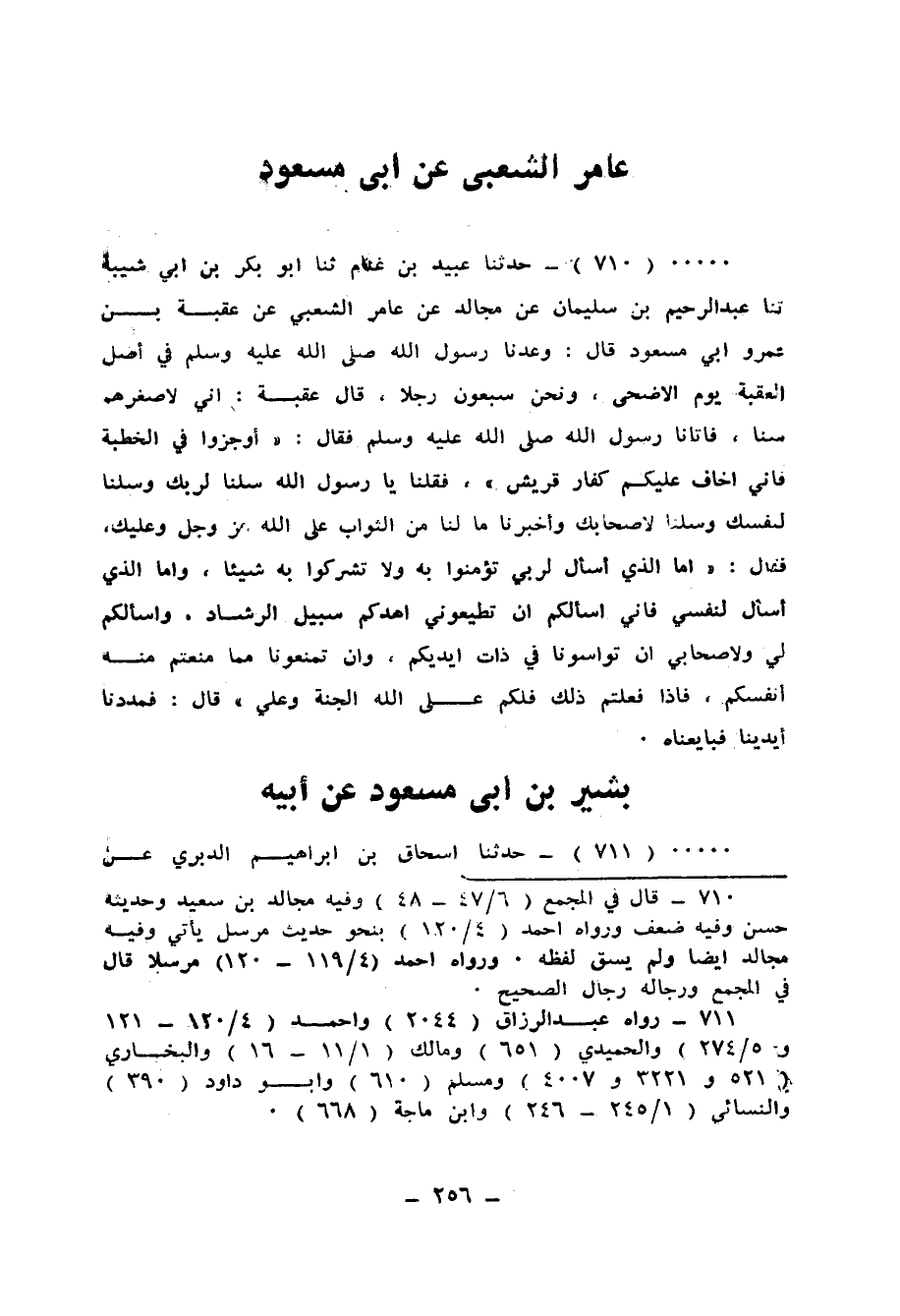 710 - حَدَّثَنَا عُبَيْدُ بْنُ غَنَّامٍ، ثَنَا أَبُو بَكْرِ بْنُ أَبِي شَيْبَةَ، ثَنَا عَبْدُ الرَّحِيمِ بْنُ سُلَيْمَانَ، عَنْ مُجَالِدٍ، عَنْ عَامِرٍ الشَّعْبِيِّ، عَنْ عُقْبَةَ بْنِ عَمْرٍو أَبِي مَسْعُودٍ قَالَ: وَعَدَنَا رَسُولُ اللهِ صَلَّى اللهُ عَلَيْهِ وَسَلَّمَ فِي أَصْلِ الْعَقَبَةِ يَوْمَ الْأَضْحَى وَنَحْنُ سَبْعُونَ رَجُلًا، قَالَ عُقْبَةُ: إنِّي لَأَصْغَرُهُمْ سِنًّا، فَأَتَانَا رَسُولُ اللهِ صَلَّى اللهُ عَلَيْهِ وَسَلَّمَ فَقَالَ: «أَوْجِزُوا فِي الْخُطْبَةِ فَإِنِّي أَخَافُ عَلَيْكُمْ كُفَّارَ قُرَيْشٍ» فَقُلْنَا: يَا رَسُولَ اللهِ، سَلْنَا لِرَبِّكَ وَسَلْنَا لِنَفْسِكَ وَسَلْنَا لِأَصْحَابِكَ، وَأَخْبِرْنَا مَا لَنَا مِنَ الثَّوَابِ عَلَى اللهِ عَزَّ وَجَلَّ وَعَلَيْكَ، فَقَالَ: «أَمَّا الَّذِي §أَسْأَلُ لِرَبِّي تُؤْمِنُوا بِهِ وَلَا تُشْرِكُوا بِهِ شَيْئًا، وَأَمَّا الَّذِي أَسْأَلُ لِنَفْسِي فَإِنِّي أَسْأَلُكُمُ أنْ تُطِيعُونِي أَهْدِكُمْ سَبِيلَ الرَّشَادِ، وَأَسْأَلُكُمْ لِي وَلِأَصْحَابِي أَنْ تُواسُونَا فِي ذَاتِ أَيْدِيكُمْ وأَنْ تَمْنَعُونَا مِمَّا مَنَعْتُمْ مِنْهُ أَنْفُسَكُمْ، فَإِذَا فَعَلْتُمْ ذَلِكَ فَلَكُمْ عَلَى اللهِ الْجَنَّةُ وَعَلَيَّ» قَالَ: فَمَدَدْنَا أَيْدِيَنَا فَبَايَعْنَاهُ