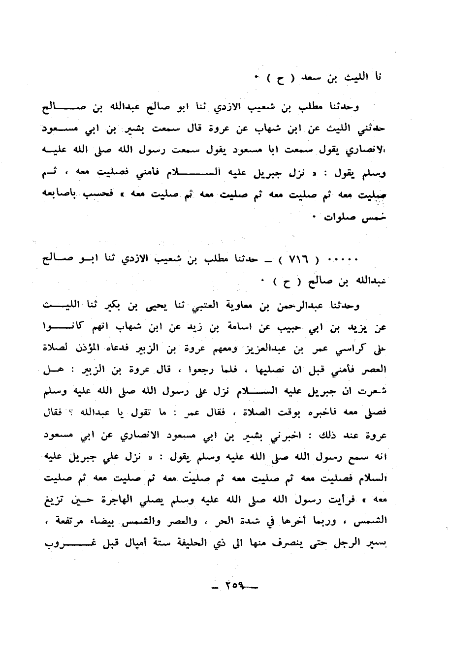 716 - حَدَّثَنَا مُطَّلِبُ بْنُ شُعَيْبٍ الْأَزْدِيُّ، ثَنَا أَبُو صَالِحٍ عَبْدُ اللهِ بْنُ صَالِحٍ، ح، وَحَدَّثَنَا عَبْدُ الرَّحْمَنِ بْنُ مُعَاوِيَةَ الْعُتْبِيُّ، ثَنَا يَحْيَى بْنُ بُكَيْرٍ، ثَنَا اللَّيْثُ، عَنْ يَزِيدَ بْنِ أَبِي حَبِيبٍ، عَنْ أُسَامَةَ بْنِ زَيْدٍ، عَنِ ابْنِ شِهَابٍ، أَنَّهُمْ كَانُوا عَلَى كَرَاسِيِّ عُمَرَ بْنِ عَبْدِ الْعَزِيزِ وَمَعَهُمْ عُرْوَةُ بْنُ الزُّبَيْرِ فَدَعَاهُ الْمُؤَذِّنُ لِصَلَاةِ الْعَصْرِ فَأَمَّنِي قَبْلَ أنْ نُصَلِّيَهَا، فَلَمَّا رَجَعُوا قَالَ عُرْوَةُ بْنُ الزُّبَيْرِ: هَلْ شَعَرْتَ أنَّ جِبْرِيلَ عَلَيْهِ السَّلَامُ نَزَلَ عَلَى رَسُولِ اللهِ صَلَّى اللهُ عَلَيْهِ وَسَلَّمَ فَصَلَّى مَعَهُ فَأَخْبَرَهُ بِوَقْتِ الصَّلَاةِ، فَقَالَ عُمَرُ: مَا تَقُولُ يَا عَبْدَ اللهِ؟ فَقَالَ عُرْوَةُ عِنْدَ ذَلِكَ: أَخْبَرَنِي بَشِيرُ بْنُ أَبِي مَسْعُودٍ الْأَنْصَارِيُّ، عَنْ أَبِي مَسْعُودٍ أَنَّهُ سَمِعَ رَسُولَ اللهِ صَلَّى اللهُ عَلَيْهِ وَسَلَّمَ يَقُولُ: §نَزَلَ عَلَيَّ جِبْرِيلُ عَلَيْهِ السَّلَامُ فَصَلَّيْتُ مَعَهُ، ثُمَّ صَلَّيْتُ مَعَهُ، ثُمَّ صَلَّيْتُ مَعَهُ، ثُمَّ صَلَّيْتُ مَعَهُ، ثُمَّ صَلَّيْتُ مَعَهُ فَرَأَيْتُ رَسُولَ اللهِ صَلَّى اللهُ عَلَيْهِ وَسَلَّمَ يُصَلِّي الْهَاجِرَةَ حِينَ تَزِيغُ الشَّمْسُ وَرُبَّمَا أَخَّرَهَا فِي شِدَّةِ الْحَرِّ، وَالْعَصْرَ وَالشَّمْسُ بَيْضَاءُ مُرْتَفِعَةٌ يَسِيرُ الرَّجُلُ حَتَّى يَنْصَرِفَ مِنْهَا إِلَى ذِي الْحُلَيْفَةِ سِتَّةَ أَمْيَالٍ قَبْلَ غُرُوبِ الشَّمْسِ، وَيُصَلِّي الْمَغْرِبَ إِذَا وَجَبَتِ الشَّمْسُ، وَيُصَلِّي الْعِشَاءَ إِذَا اسْوَدَّ الْأُفُقُ، وَيُصَلِّي الصُّبْحَ بِغَلَسٍ، ثُمَّ صَلَّاهَا يَوْمًا فَأَسْفَرَ بِهَا، ثُمَّ لَمْ يَعُدْ إِلَى الْإِسْفَارِ حَتَّى قَبَضَهُ اللهُ " وَاللَّفْظُ لِأَبِي صَالِحٍ
