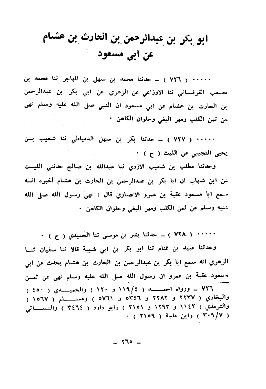 728 - حَدَّثَنَا بِشْرُ بْنُ مُوسَى، ثَنَا الْحُمَيْدِيُّ، ح، وَحَدَّثَنَا عُبَيْدُ بْنُ غَنَّامٍ، ثَنَا أَبُو بَكْرِ بْنُ أَبِي شَيْبَةَ قَالَا: ثَنَا سُفْيَانُ، ثَنَا الزُّهْرِيُّ، أَنَّهُ سَمِعَ أَبَا بَكْرِ بْنَ عَبْدِ الرَّحْمَنِ بْنِ الْحَارِثِ بْنِ هِشَامٍ، يُحَدِّثُ عَنْ أَبِي مَسْعُودٍ عُقْبَةَ بْنِ عَمْرٍو أنَّ رَسُولَ اللهِ صَلَّى اللهُ عَلَيْهِ وَسَلَّمَ «§نَهَى عَنْ ثَمَنِ الْكَلْبِ، وَمَهْرِ الْبَغِيِّ، وَحُلْوَانِ الْكَاهِنِ»