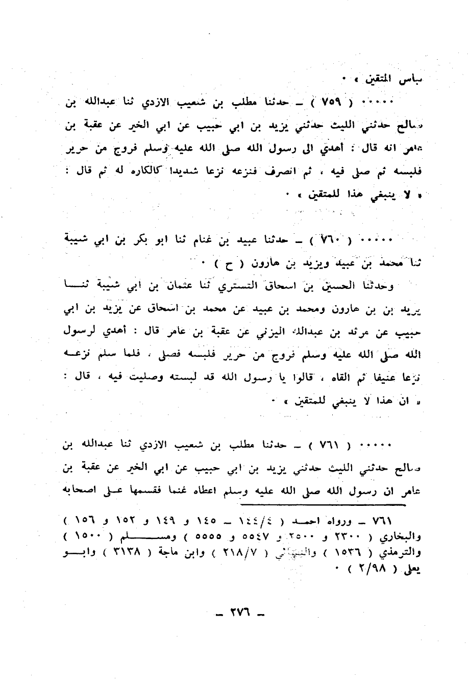 759 - حَدَّثَنَا مُطَّلِبُ بْنُ شُعَيْبٍ الْأَزْدِيُّ، ثَنَا عَبْدُ اللهِ بْنُ صَالِحٍ، حَدَّثَنِي اللَّيْثُ، حَدَّثَنِي يَزِيدُ بْنُ أَبِي حَبِيبٍ، عَنْ أَبِي الْخَيْرِ، عَنْ عُقْبَةَ بْنِ عَامِرٍ، أَنَّهُ قَالَ: أُهْدِيَ إِلَى رَسُولِ اللهِ صَلَّى اللهُ عَلَيْهِ وَسَلَّمَ فَرُّوجٌ مِنْ حَرِيرٍ فَلَبِسَهُ، ثُمَّ صَلَّى فِيهِ، ثُمَّ انْصَرَفَ فَنَزَعَهُ نَزْعًا شَدِيدًا كَالْكَارِهِ لَهُ، ثُمَّ قَالَ: «§لَا يَنْبَغِي هَذَا لِلْمُتَّقِينَ»
